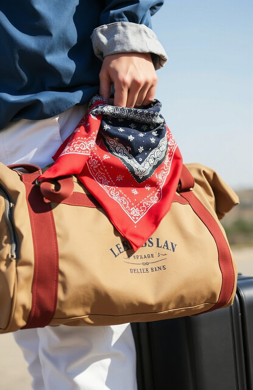 Add a bandana to your duffle bag for a stylish travel companion. This is great for adding a pop of color to your luggage.