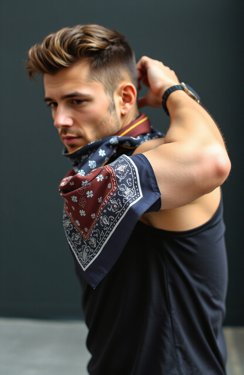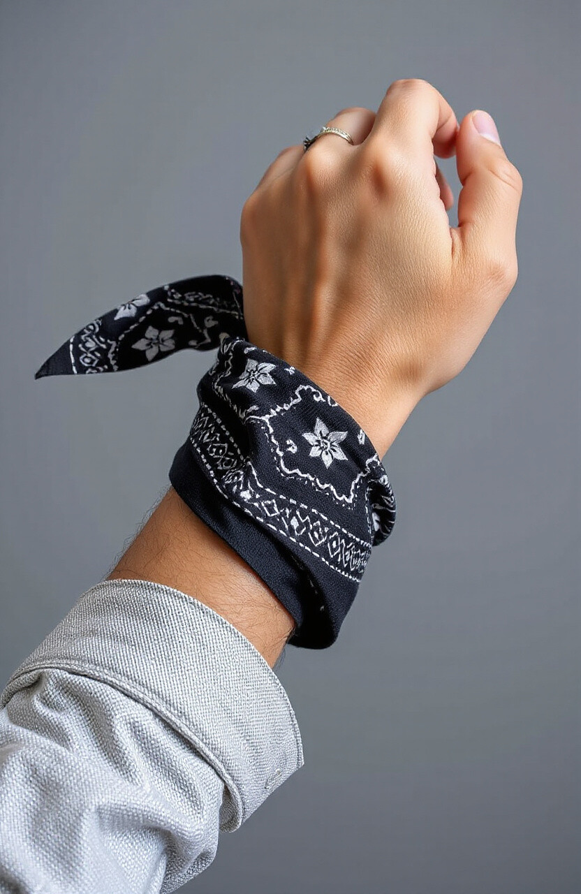 Give your wrists some attention by turning a bandana into a unique wrist wrap. It’s a simple yet effective way to add flair to your style.