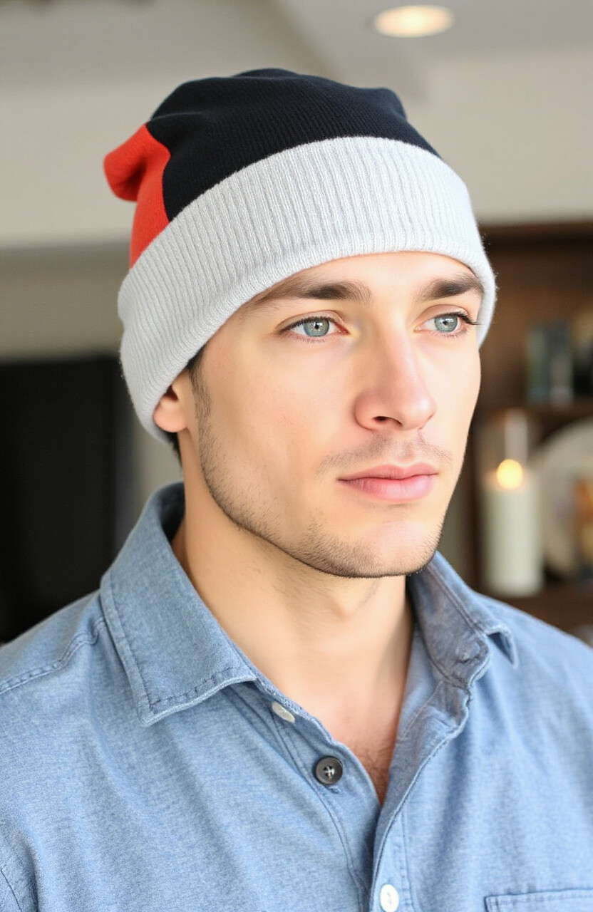 Make a bold statement with a beanie that features contrasting color blocks. It’s modern and eye-catching.