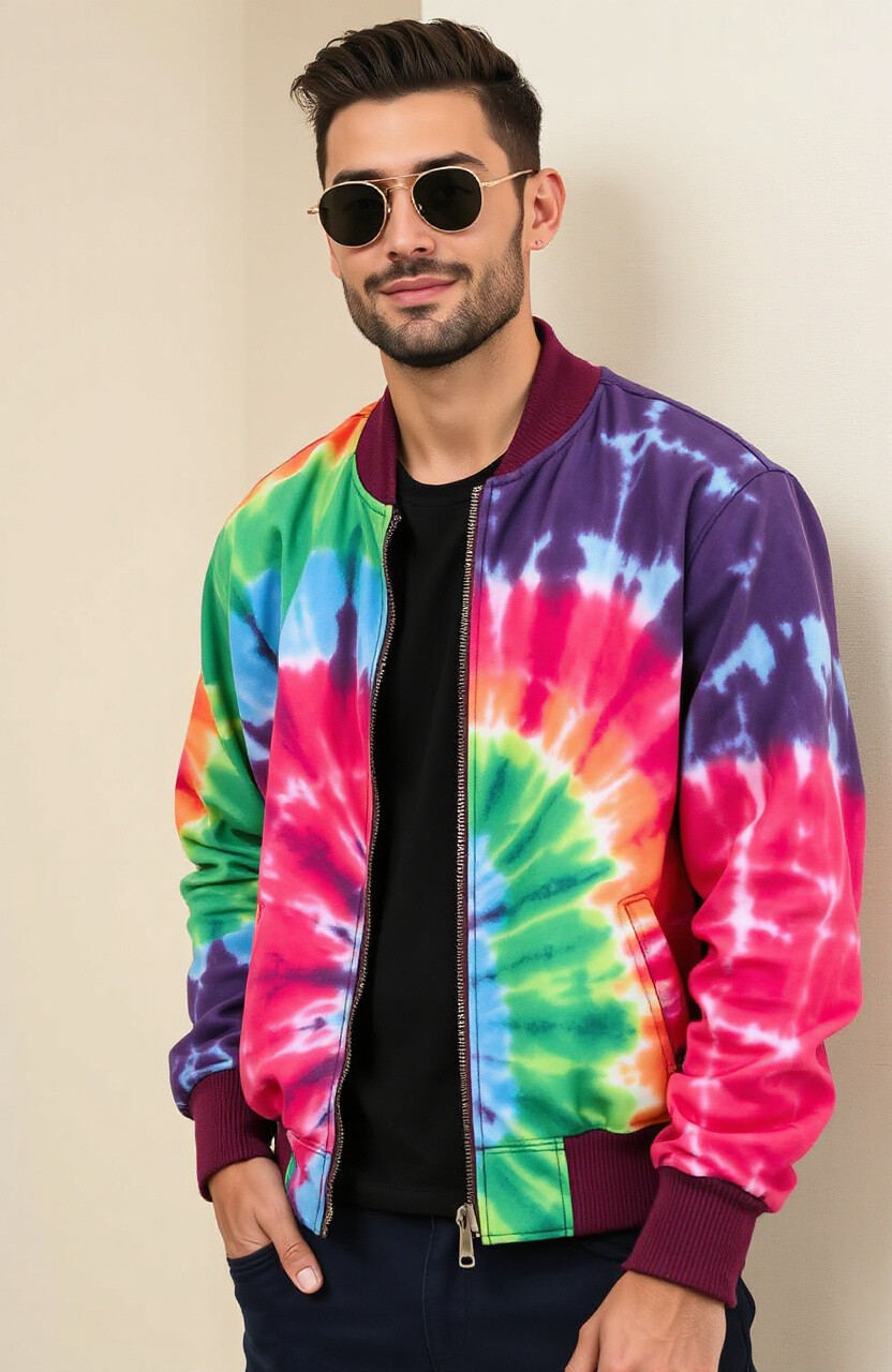 Add color to your wardrobe with a tie-dye bomber jacket. It’s vibrant and playful, perfect for a fun look. Pair it with simple outfits to let the colors pop.