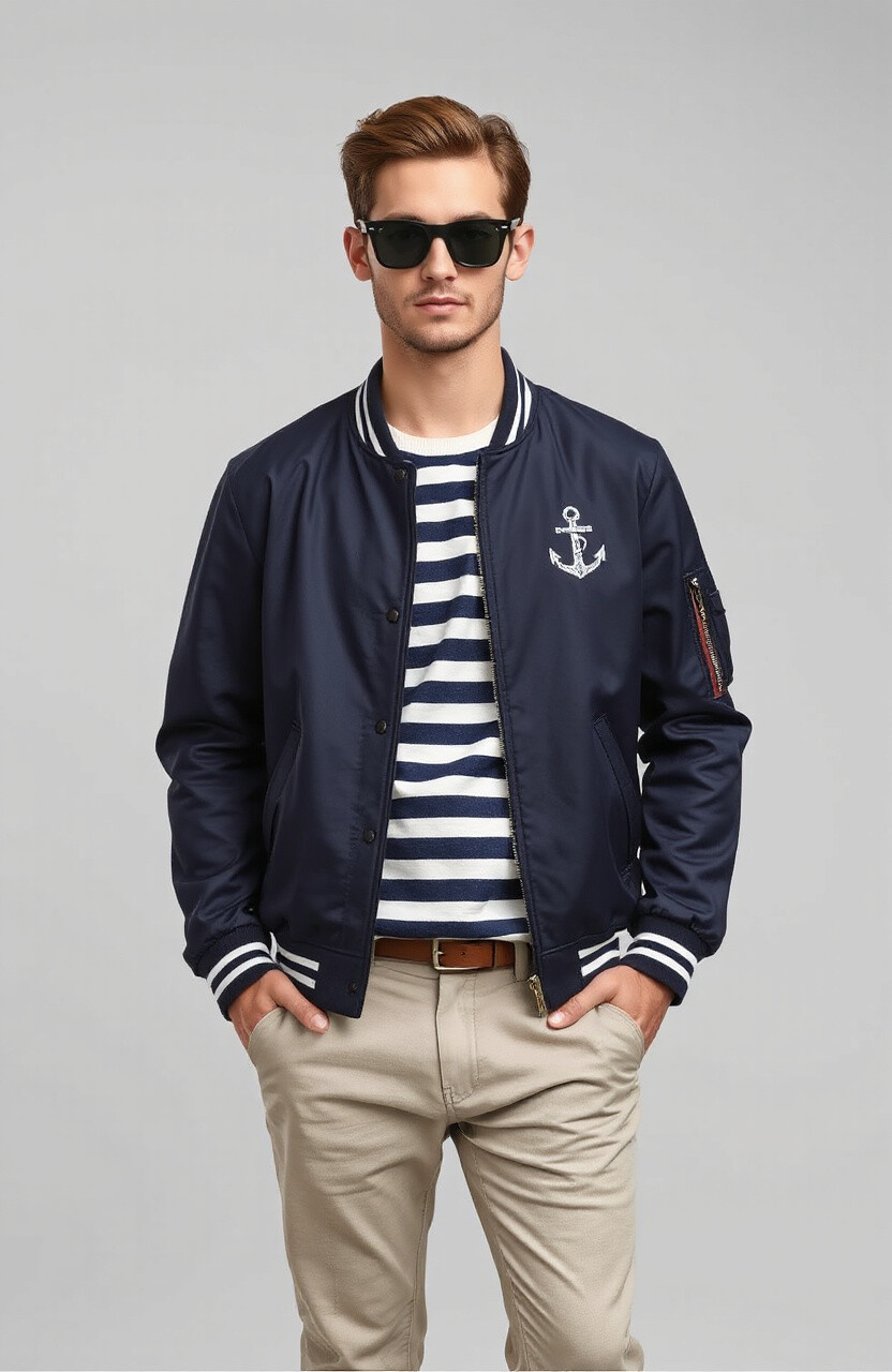 Channel nautical vibes with a navy bomber jacket. It’s classic and timeless, perfect for any season. Pair it with stripes for a sailor-inspired look.