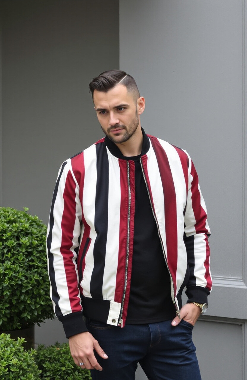 Make a statement with bold stripes on your bomber jacket. It’s eye-catching and dynamic, perfect for a playful look. Pair it with solid colors for balance.