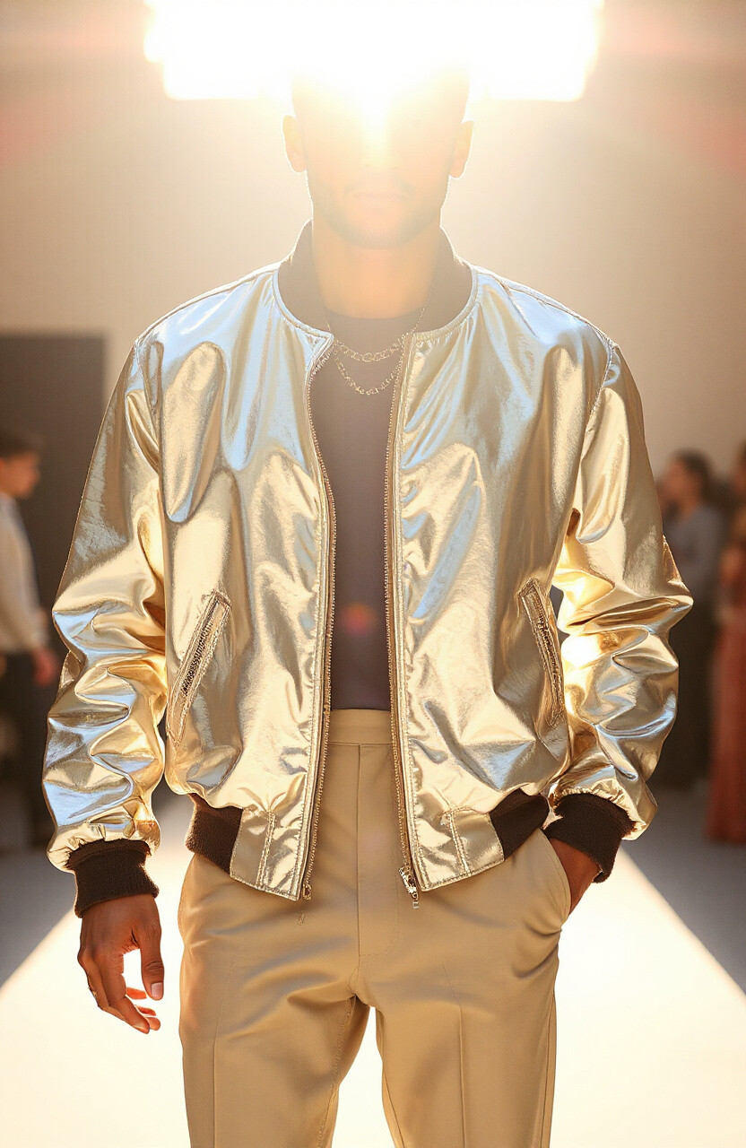 Shine bright with a metallic bomber jacket. It’s futuristic and edgy, perfect for standing out in a crowd. Pair it with simple outfits to let the jacket be the star.