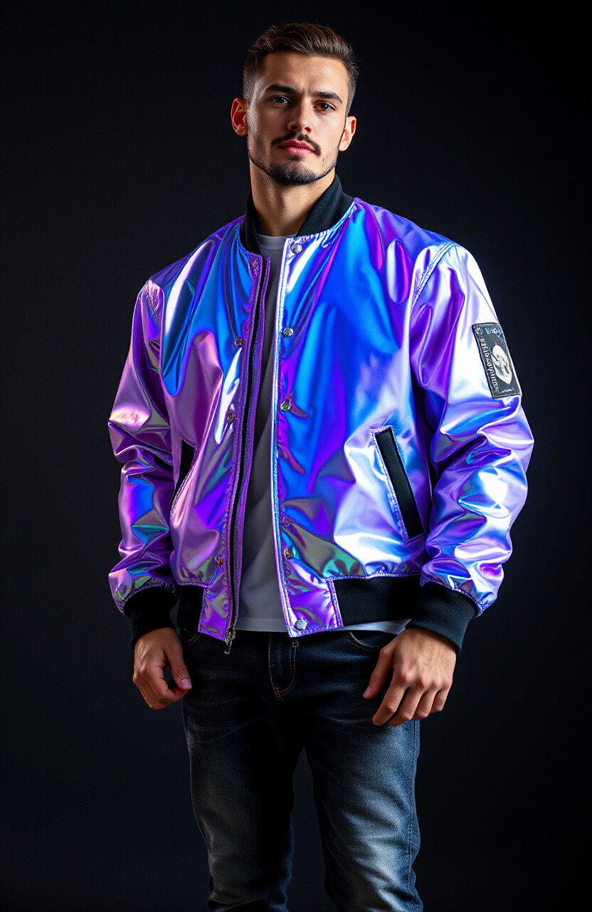 Stand out with a holographic bomber jacket. It’s futuristic and unique, perfect for making a statement. Pair it with simple outfits to let the jacket shine.