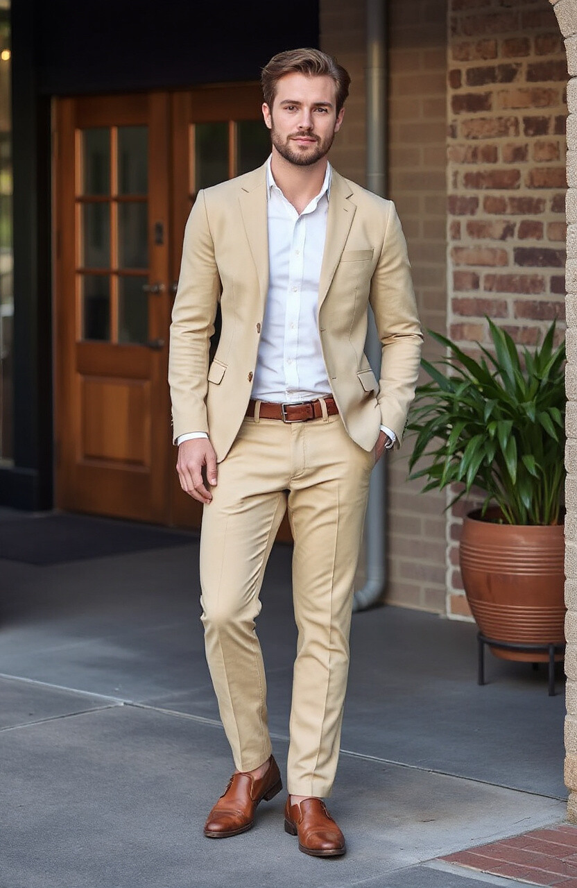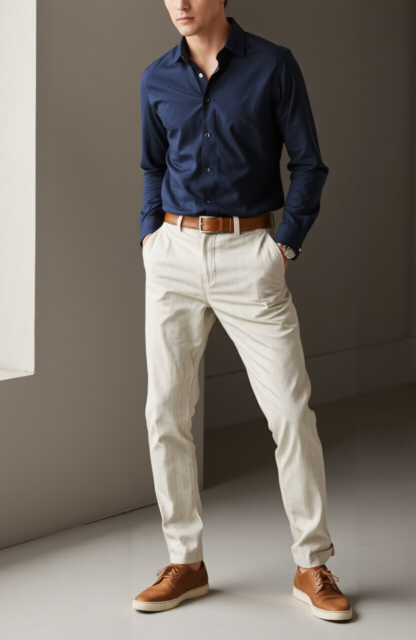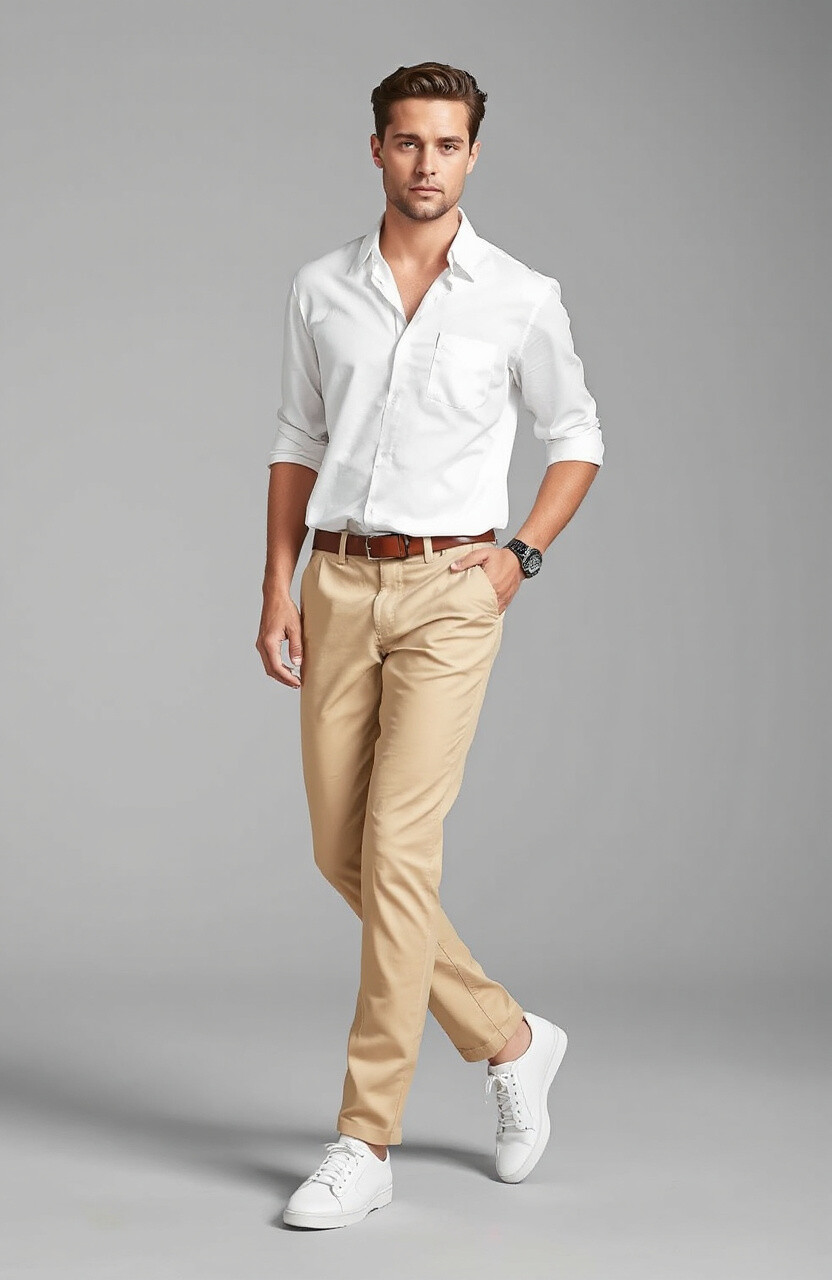 Khakis are versatile, and you can dress them up or down. Pair with a crisp white shirt for a sharp look.