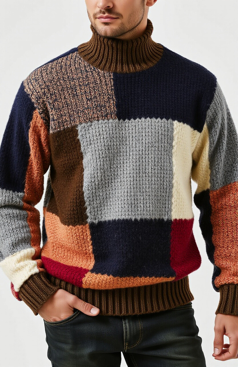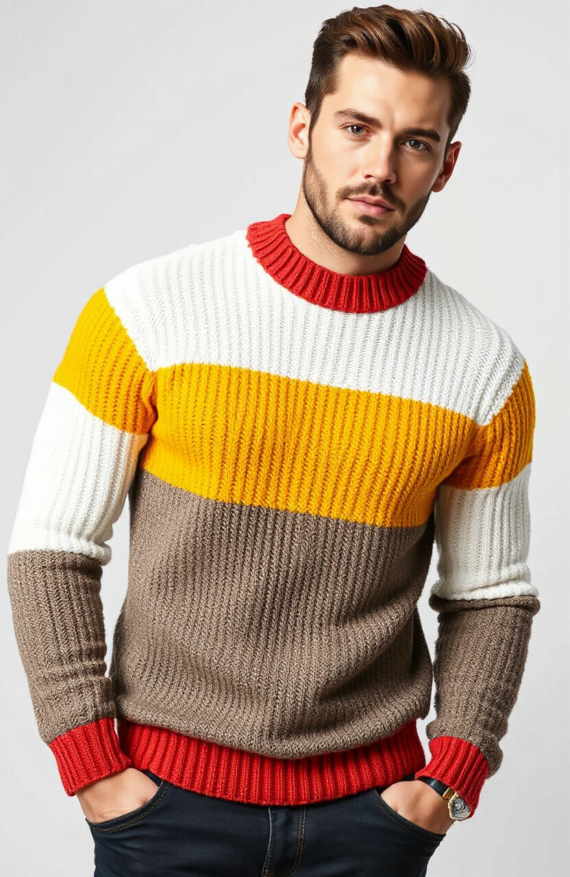 Bold, contrasting colors make this sweater a standout piece. It’s a fresh take on the traditional sweater, adding a pop to any outfit. Great for those who love to make a statement.