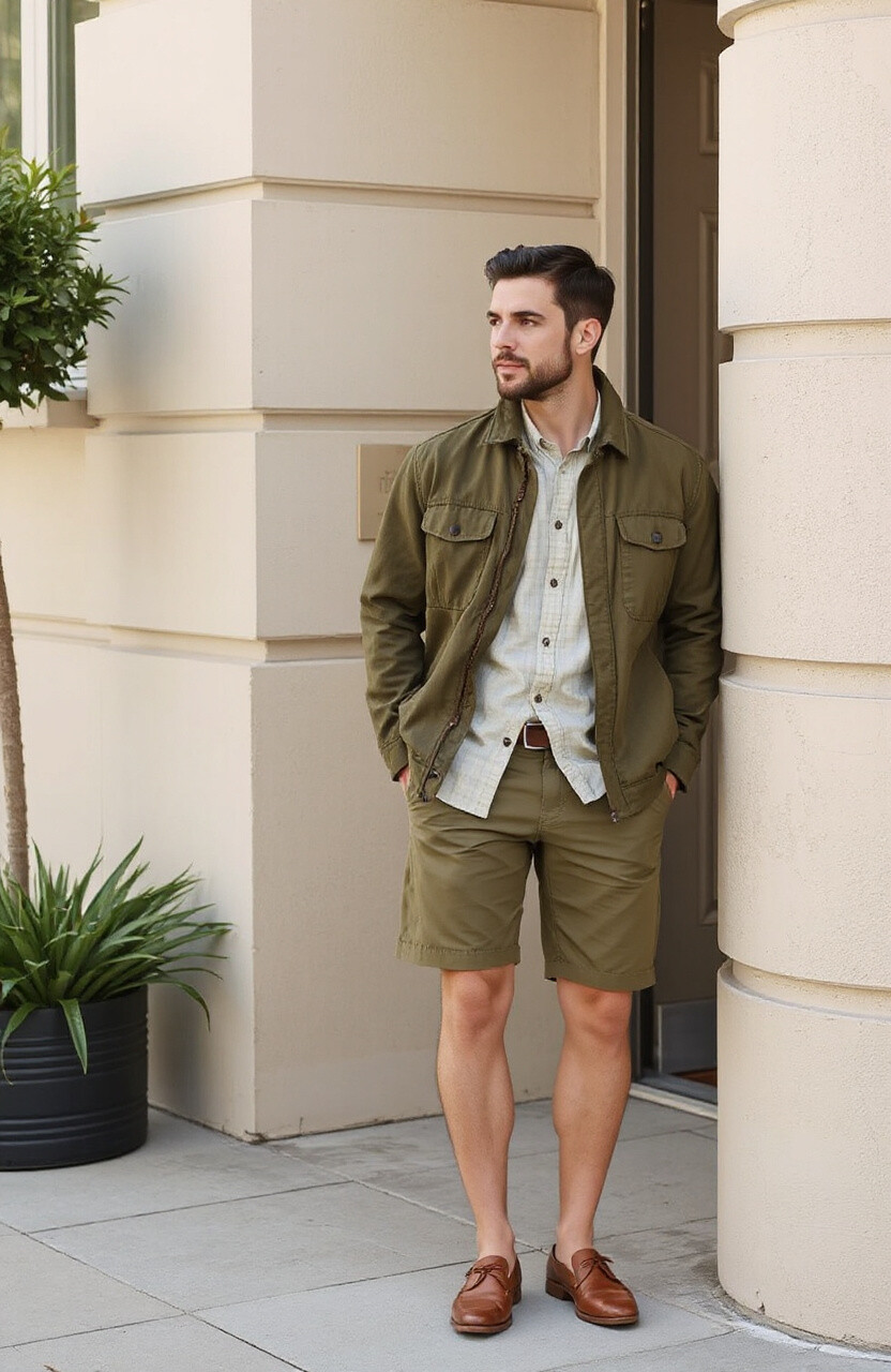 Try an olive jacket with beige trousers or a beige shirt with olive shorts. It’s a subtle combo that’s easy to personalize with leather accessories.