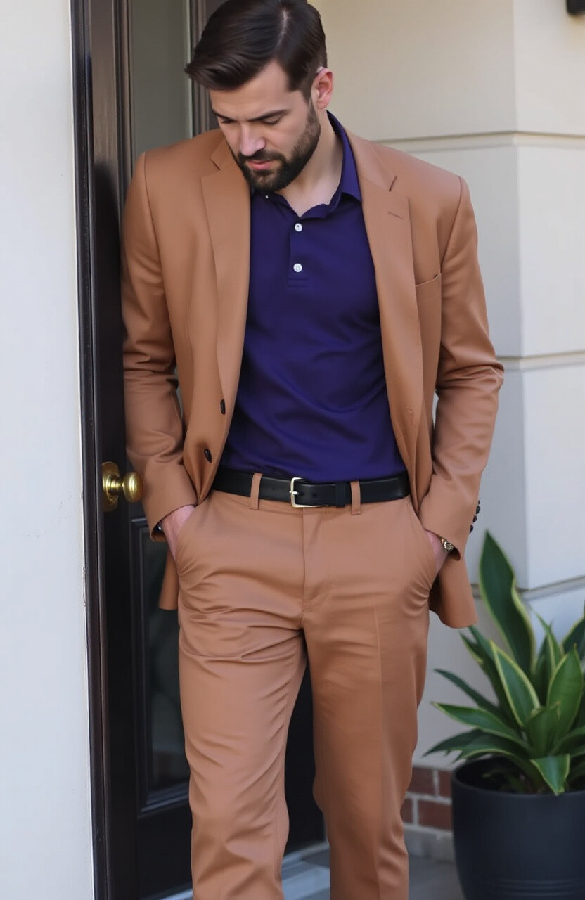 Try a purple shirt with tan pants or a tan blazer over a purple tee. It’s a unique and sophisticated combo that stands out without being loud.