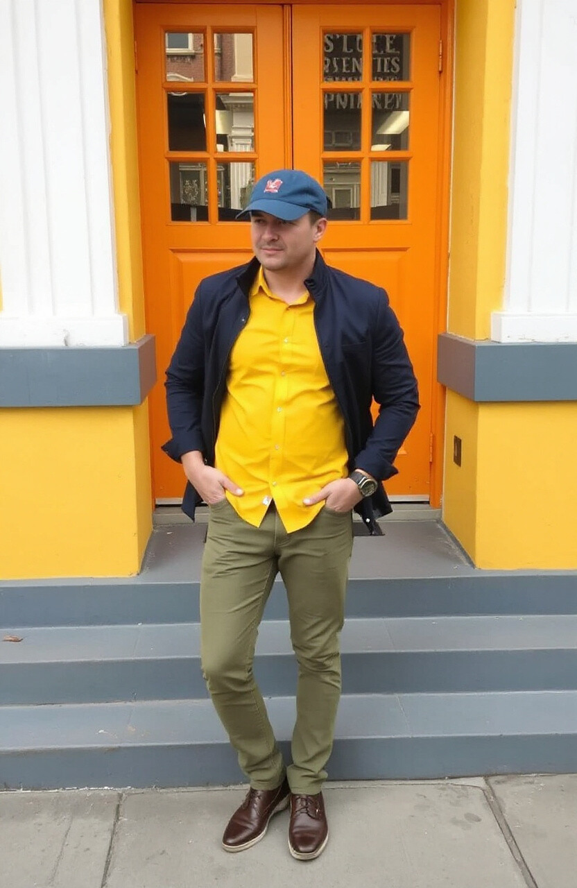 Pair a navy jacket with yellow pants or a yellow shirt with navy jeans. It’s a fun and vibrant look that’s easy on the wallet and can be accessorized with a cap or watch.