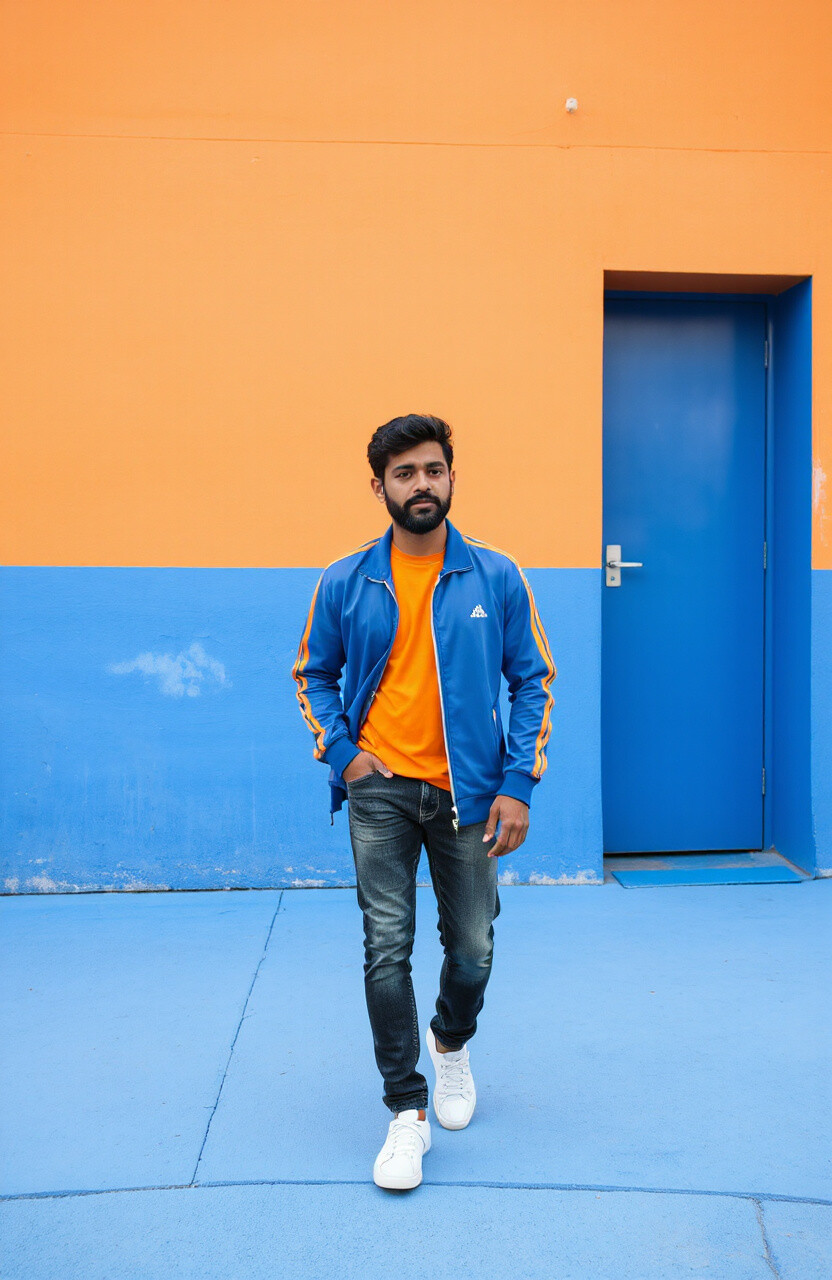 Wear an orange t-shirt with blue jeans or a blue jacket over an orange tee. It’s easy to achieve and budget-friendly. Add some white sneakers for a fresh touch.