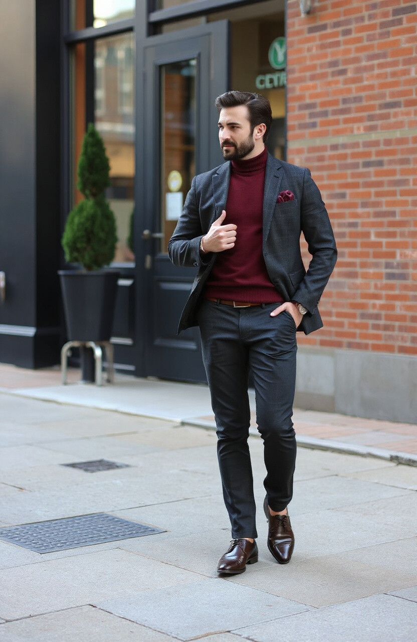 Try a burgundy sweater with charcoal pants or a charcoal blazer over a burgundy shirt. This combo is classy and easy to personalize with a pocket square or watch.