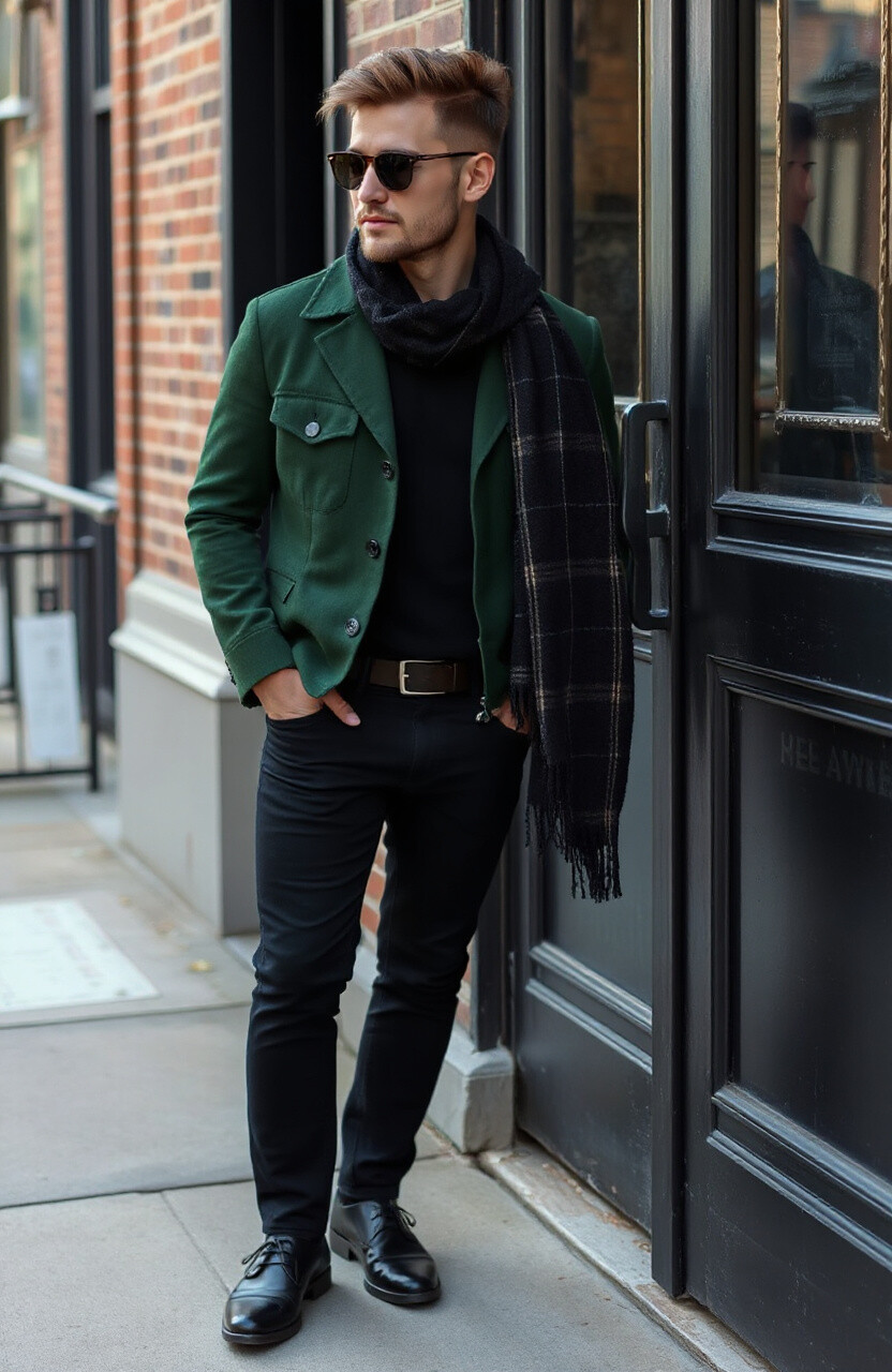 Try a forest green jacket with black pants or a black shirt with forest green accents. It’s a classy look that’s easy to personalize with a scarf or gloves.