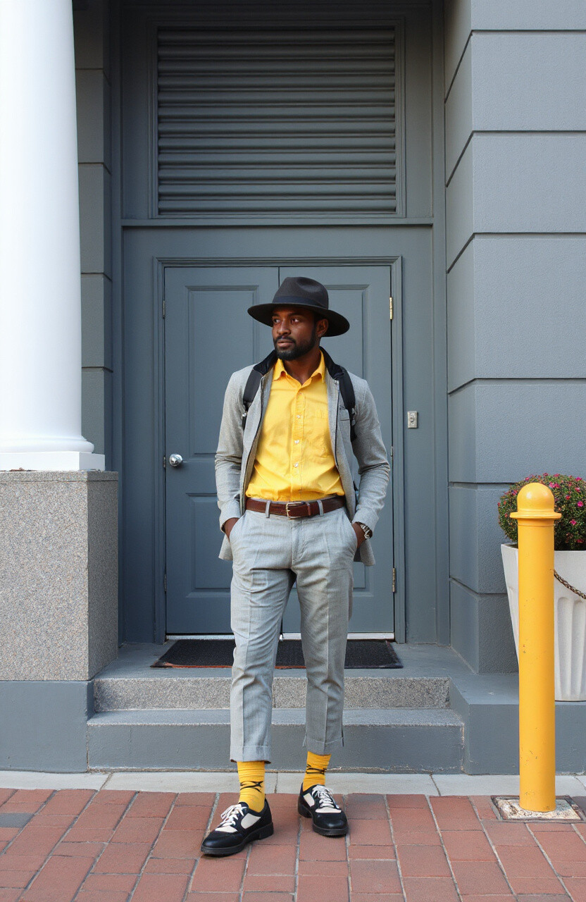 Pair a yellow shirt with grey trousers. It’s a trendy and refreshing look that can be personalized with funky socks or a cool hat.