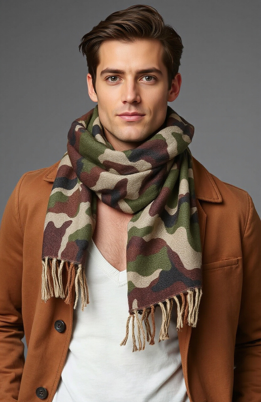 Blend in while standing out with a camouflage scarf. The military-inspired pattern is both rugged and trendy.