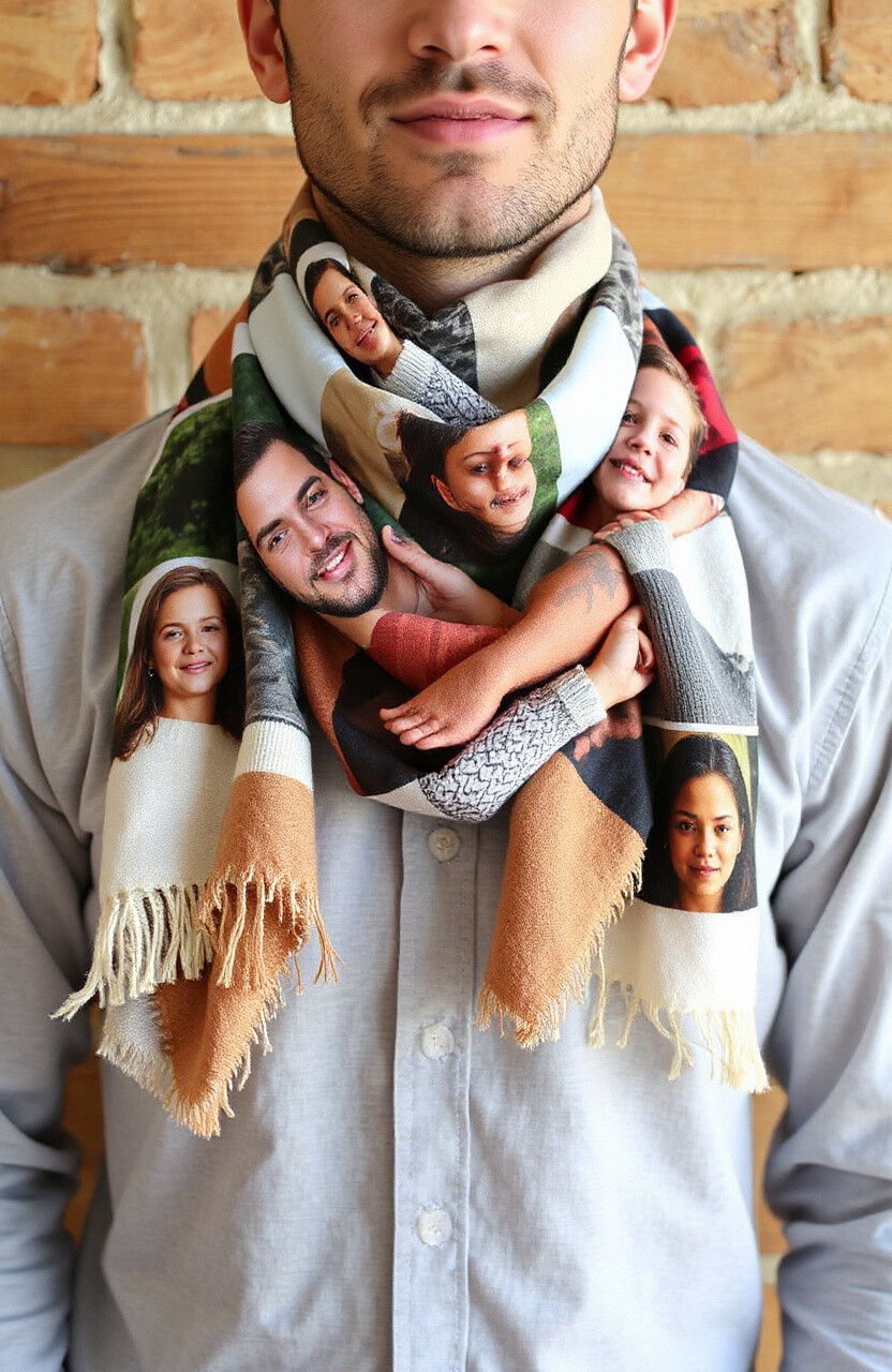 Carry your memories with you with a personalized photo scarf. Add your favorite photos for a truly unique accessory.