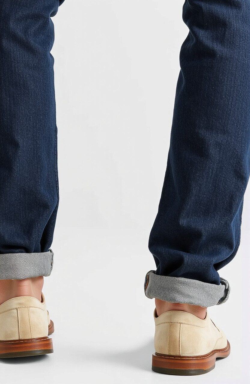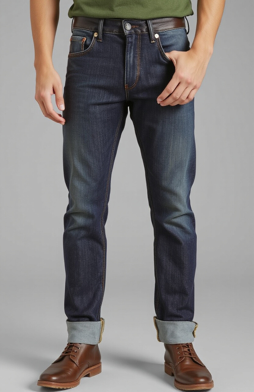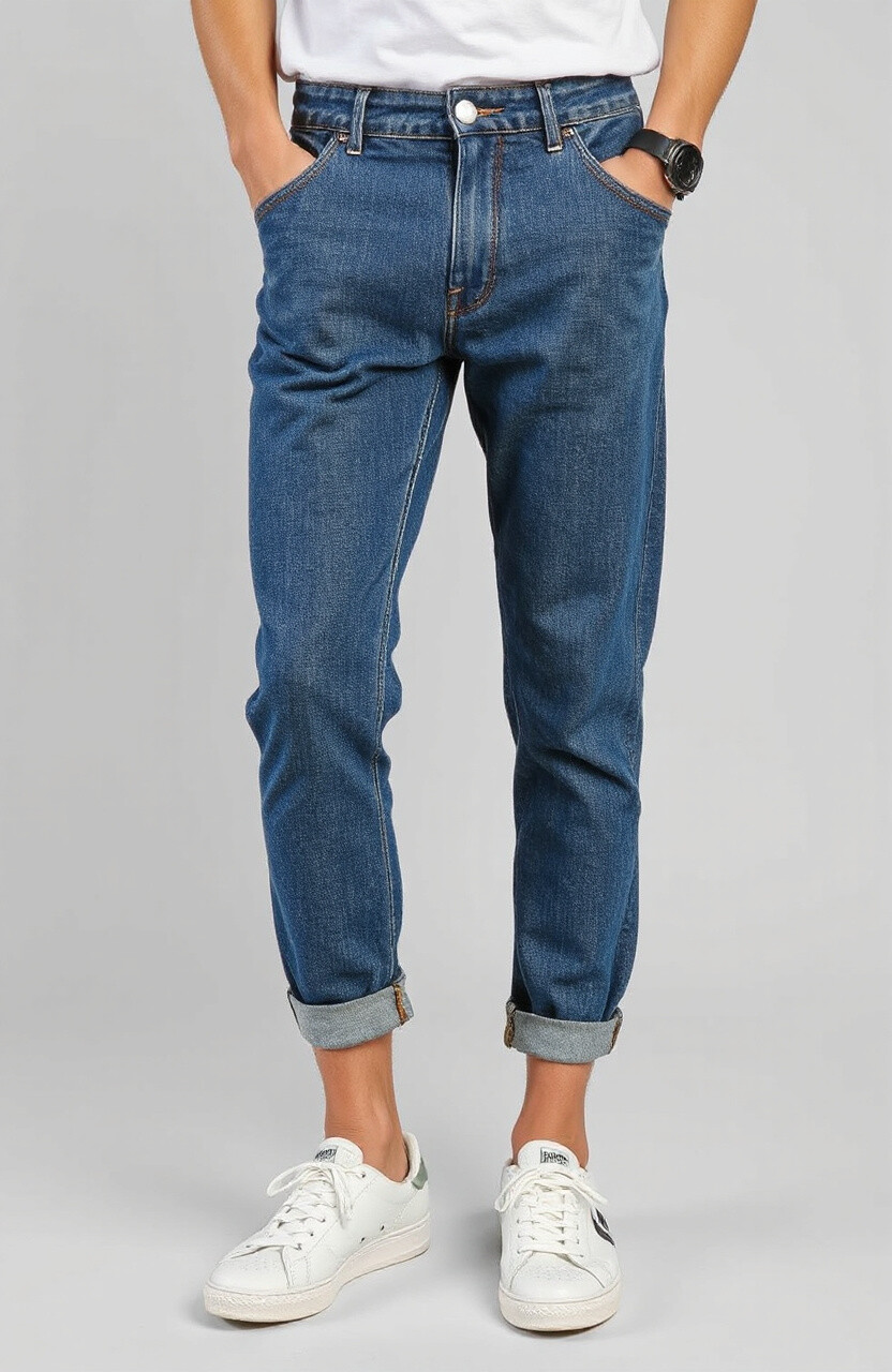 These timeless blue jeans with a simple cuff are perfect for any occasion. The deep blue hue pairs easily with almost any shirt or jacket, making it a versatile option. The cuff adds a touch of style without being overwhelming.