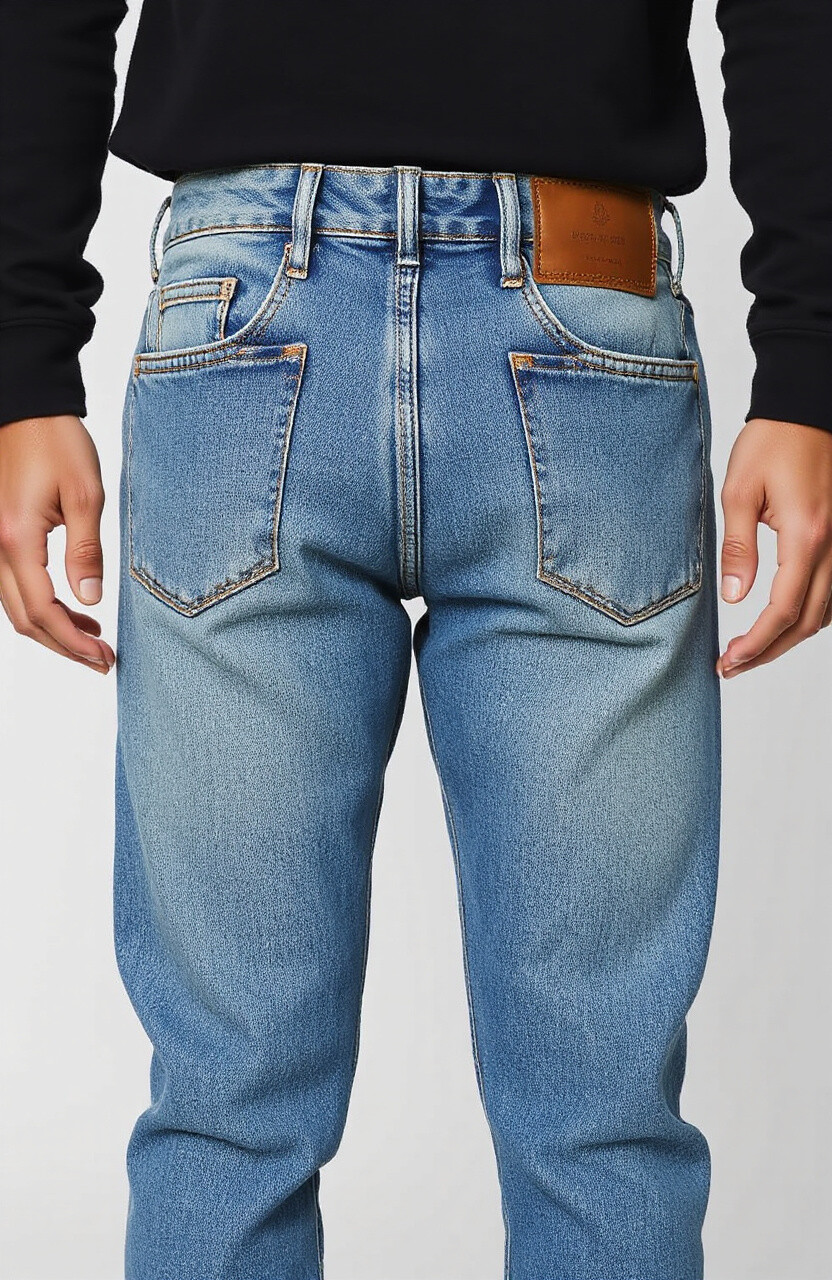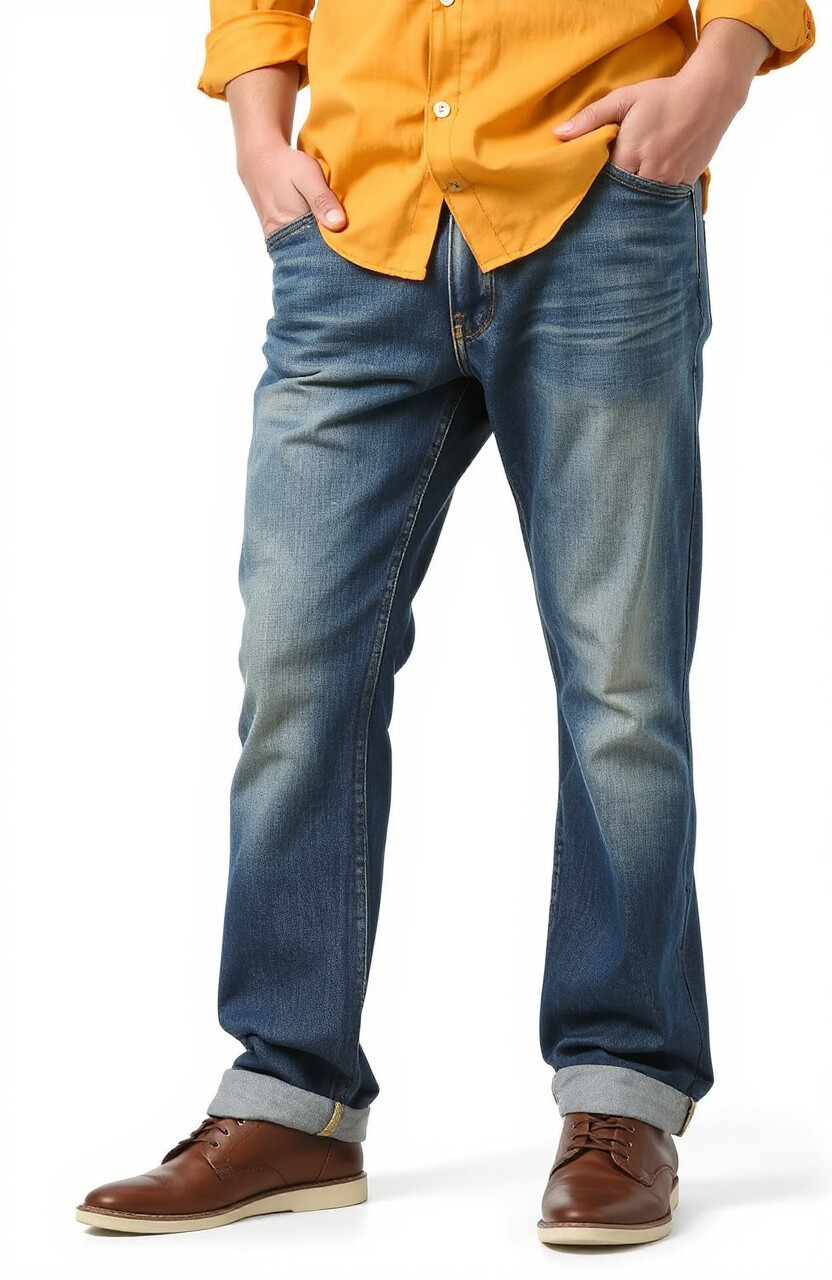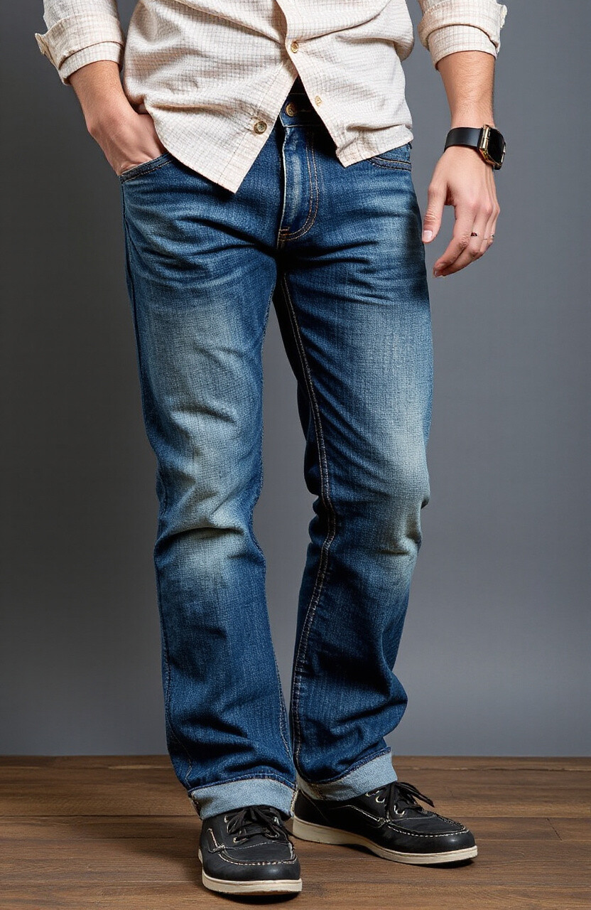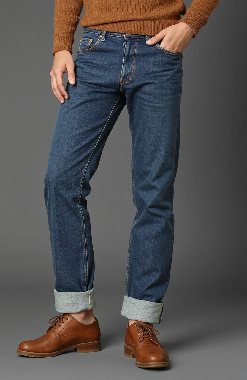These timeless blue jeans with a simple cuff are perfect for any occasion. The deep blue hue pairs easily with almost any shirt or jacket, making it a versatile option. The cuff adds a touch of style without being overwhelming.
