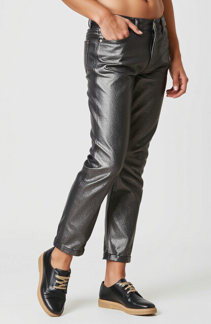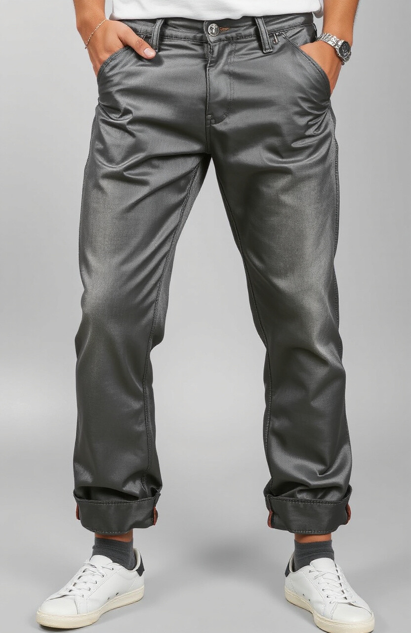 Metallic jeans with cuffs offer a bold and futuristic look. They’re perfect for those who love to make a statement with their fashion.