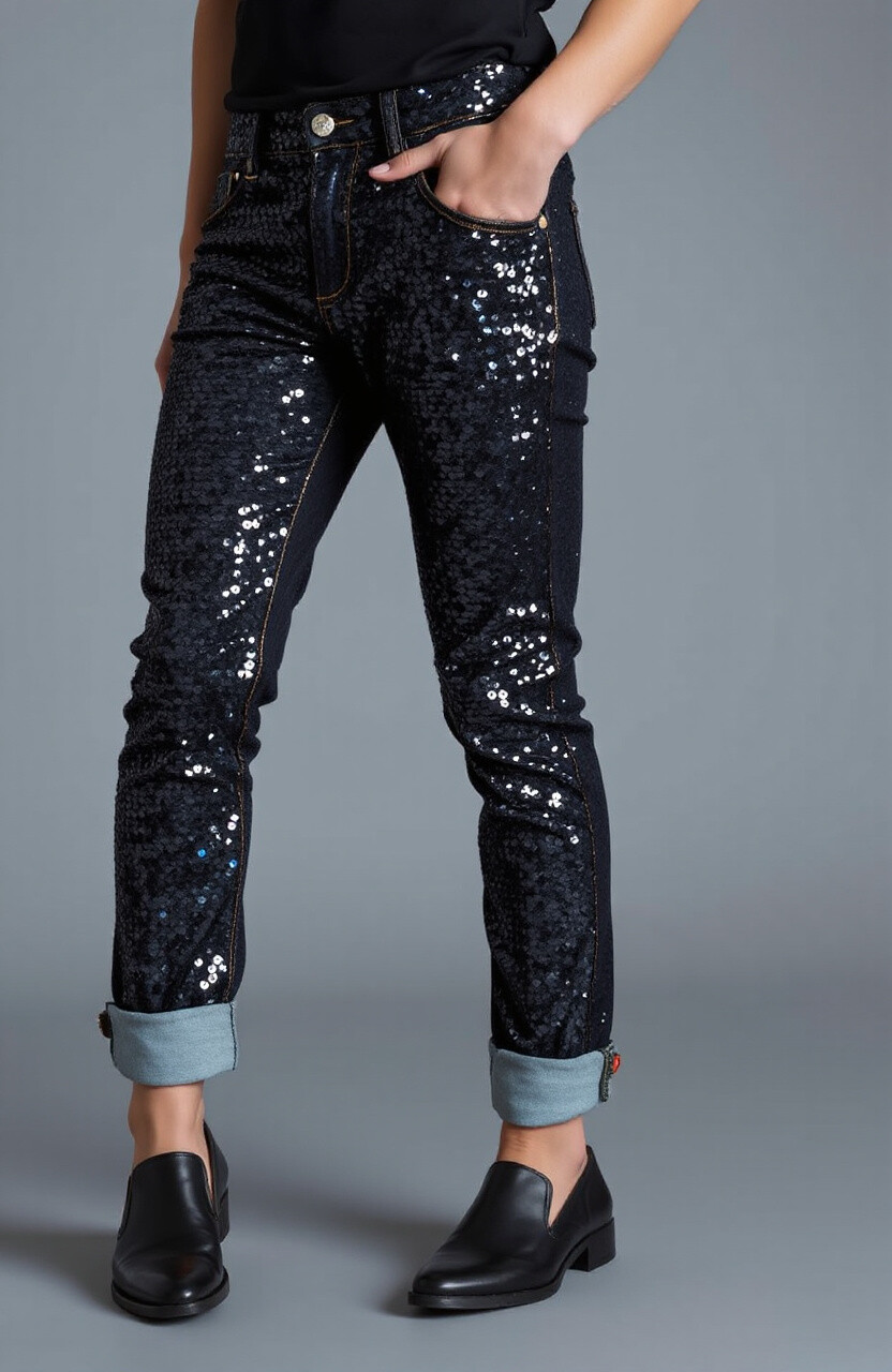 Sequin jeans with cuffs offer a glamorous and eye-catching look. They’re perfect for those who love to add a bit of sparkle to their fashion.