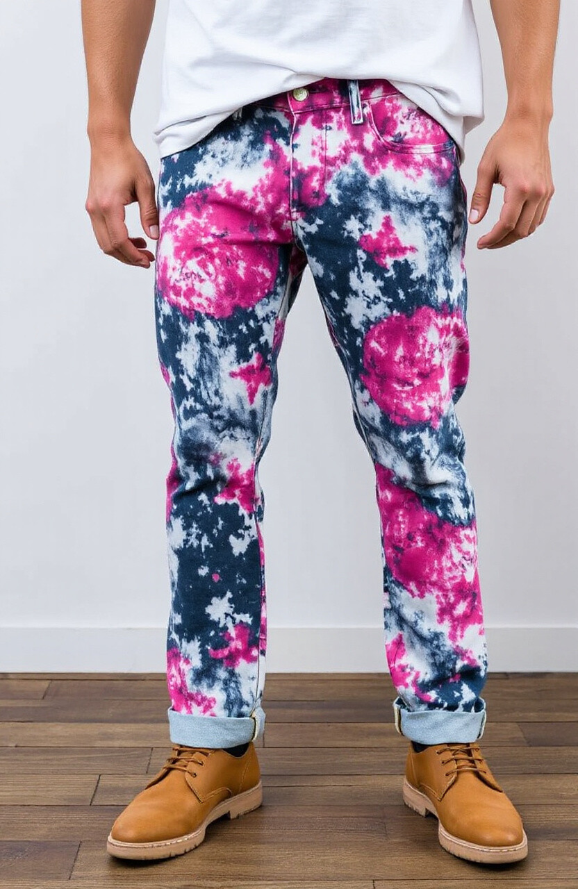 Tie-dye jeans with cuffs offer a fun and colorful look. They’re perfect for those who love to add a bit of color to their fashion.