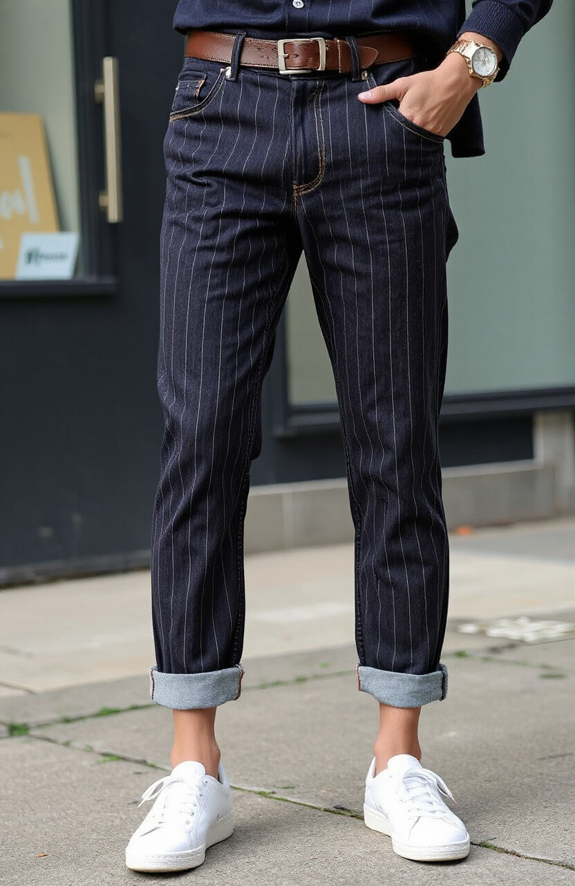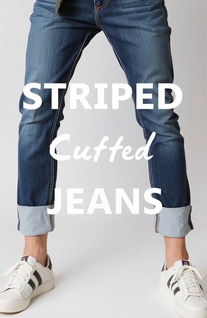 Striped jeans with cuffs offer a fresh and modern look. They’re perfect for those who love a bit of pattern in their fashion.