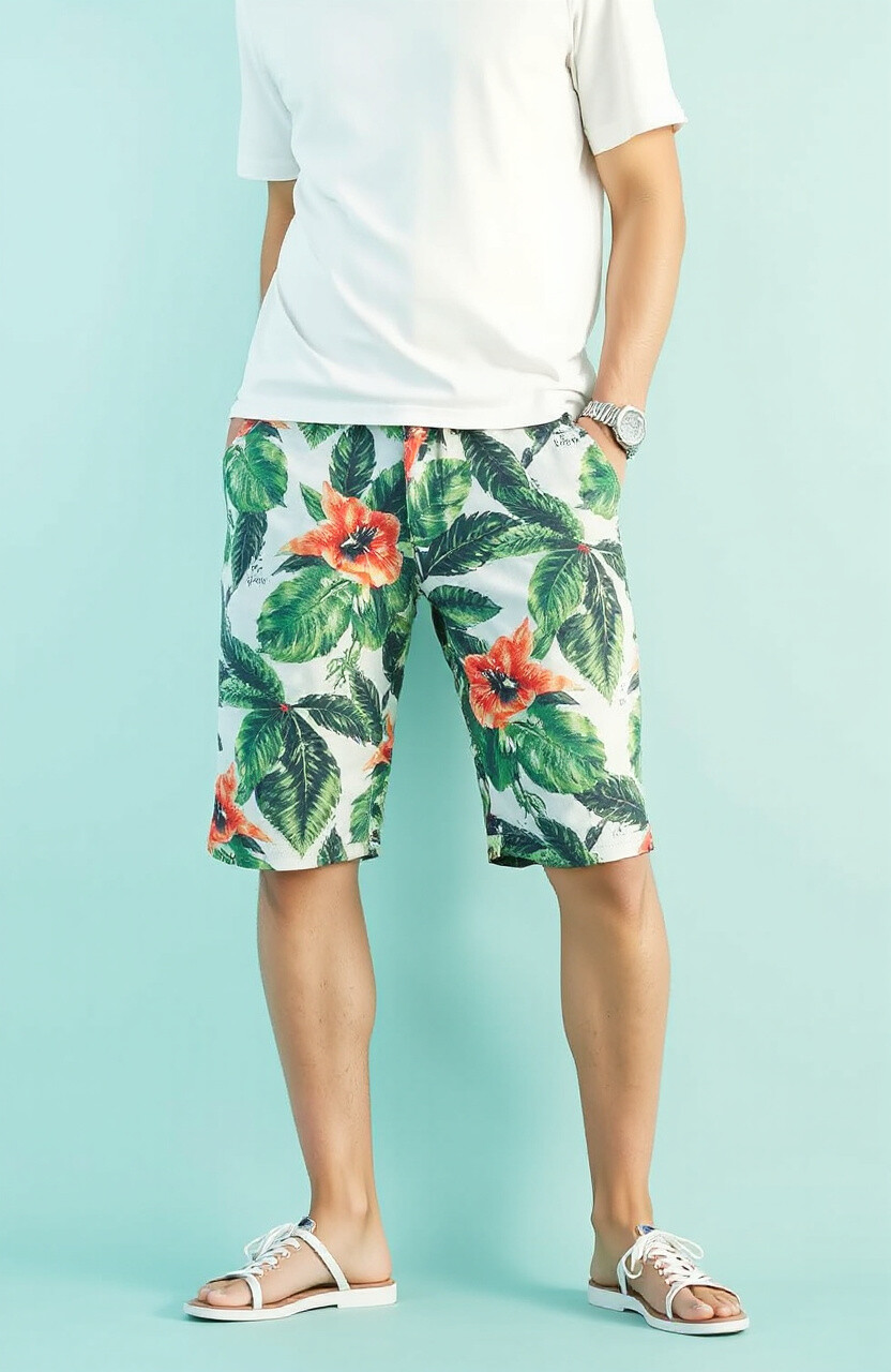 Add some island flair with tropical patterned shorts. They’re lively and perfect for summer fun.