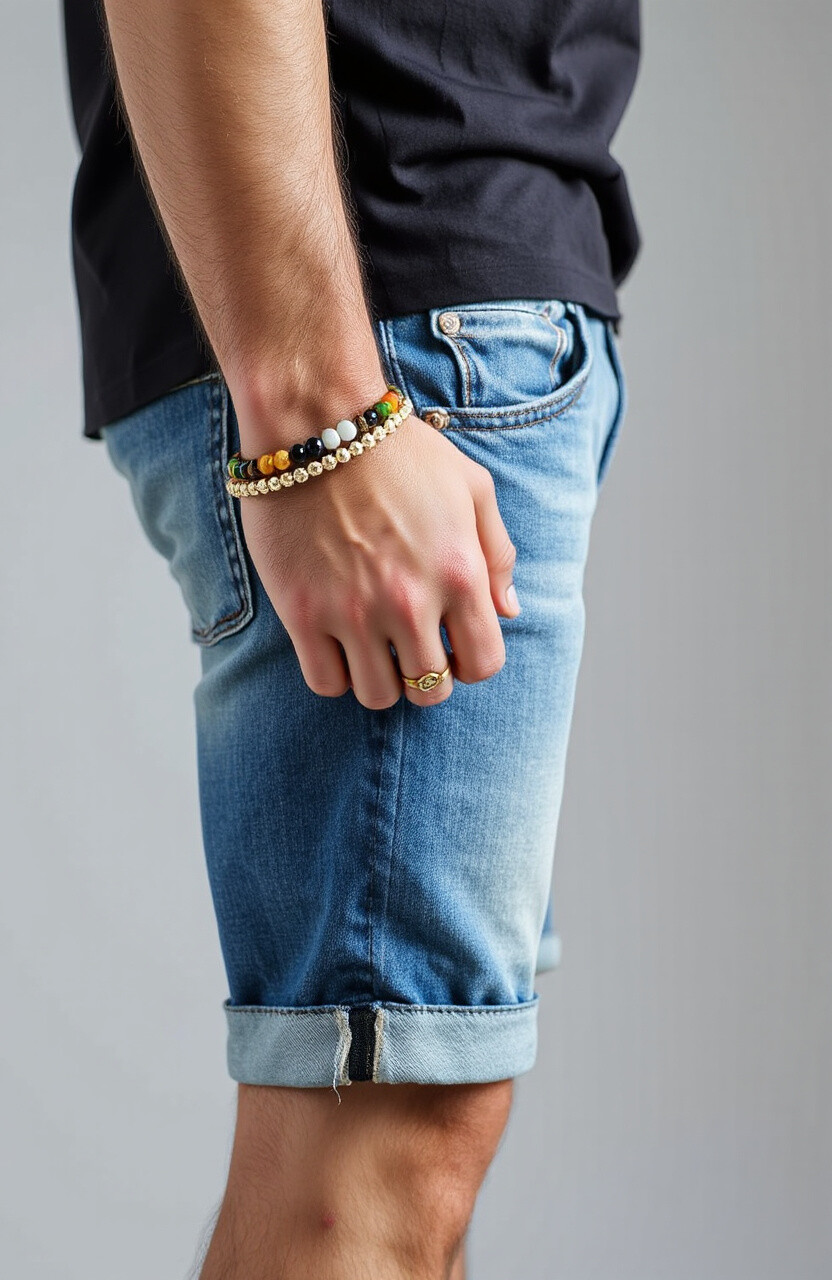 Add some flair with beaded bracelets. They’re a subtle way to accessorize your denim shorts without overpowering the look.