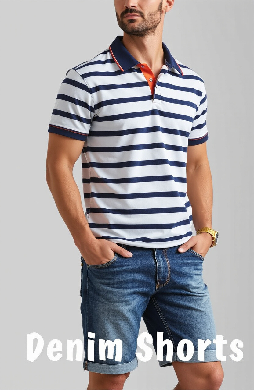 Stripes add a touch of sophistication. A striped polo shirt with denim shorts gives you a sporty yet polished appearance. Ideal for a casual brunch or a day at the park.