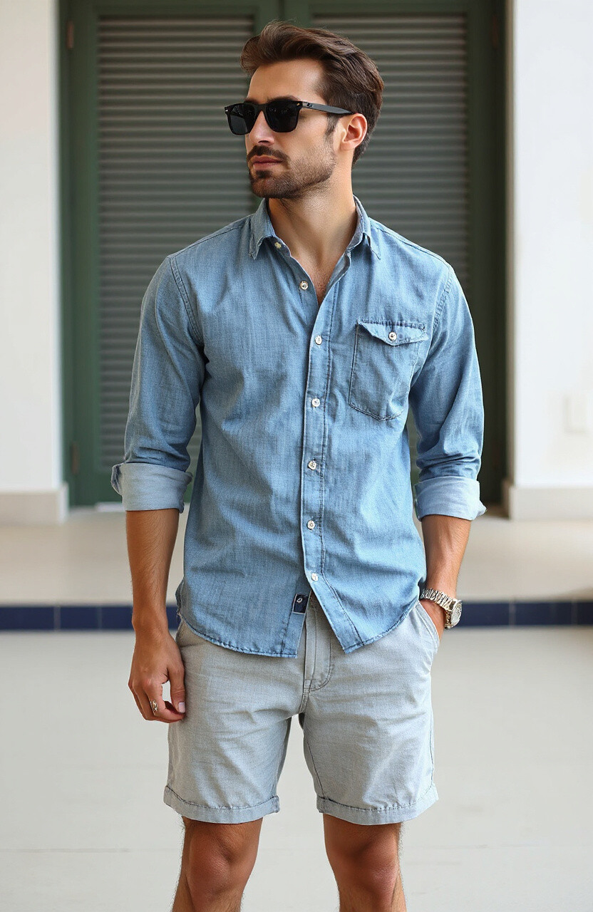 Linen shirts are perfect for hot weather. They’re breathable and pair wonderfully with denim shorts for a relaxed, beachy look.