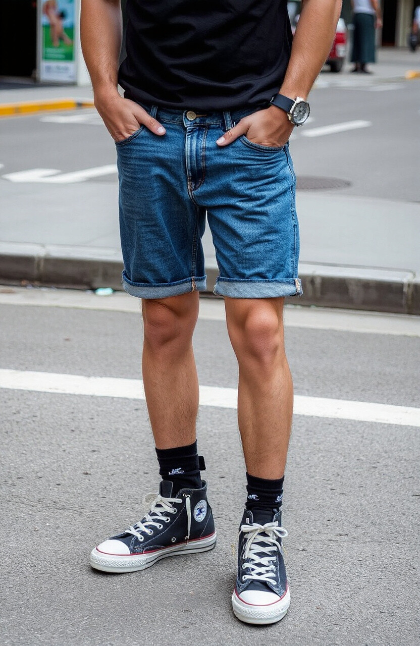 Add some street style with high-top sneakers. They bring a cool, urban edge to your denim shorts.