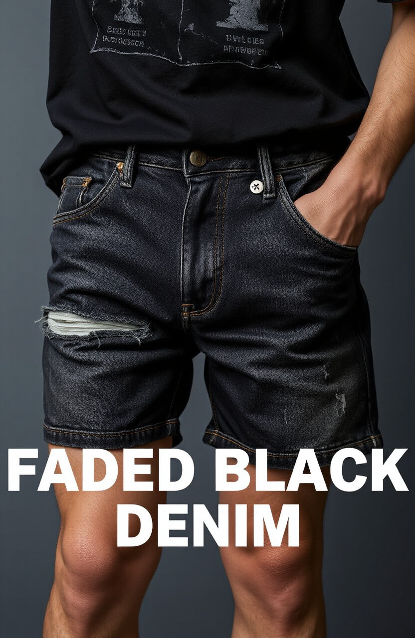 Faded black denim shorts offer a cool, edgy alternative to traditional blue. They’re versatile and stylish.