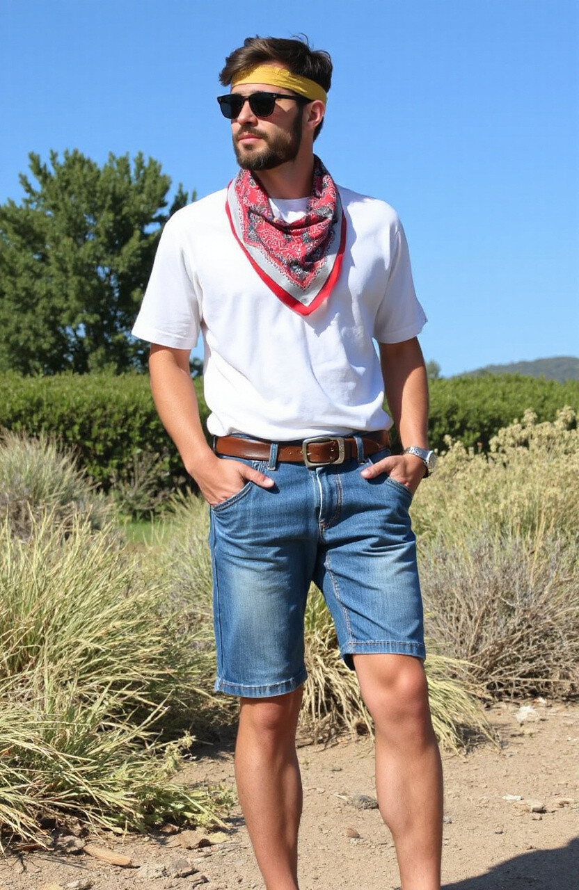 Add a bandana for a hint of cowboy charm. It’s an easy way to accessorize your denim shorts.