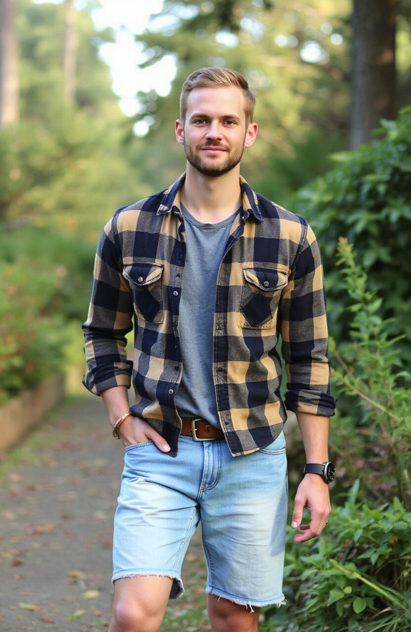 Channel your inner lumberjack with a flannel shirt. It adds warmth and texture to your denim shorts.