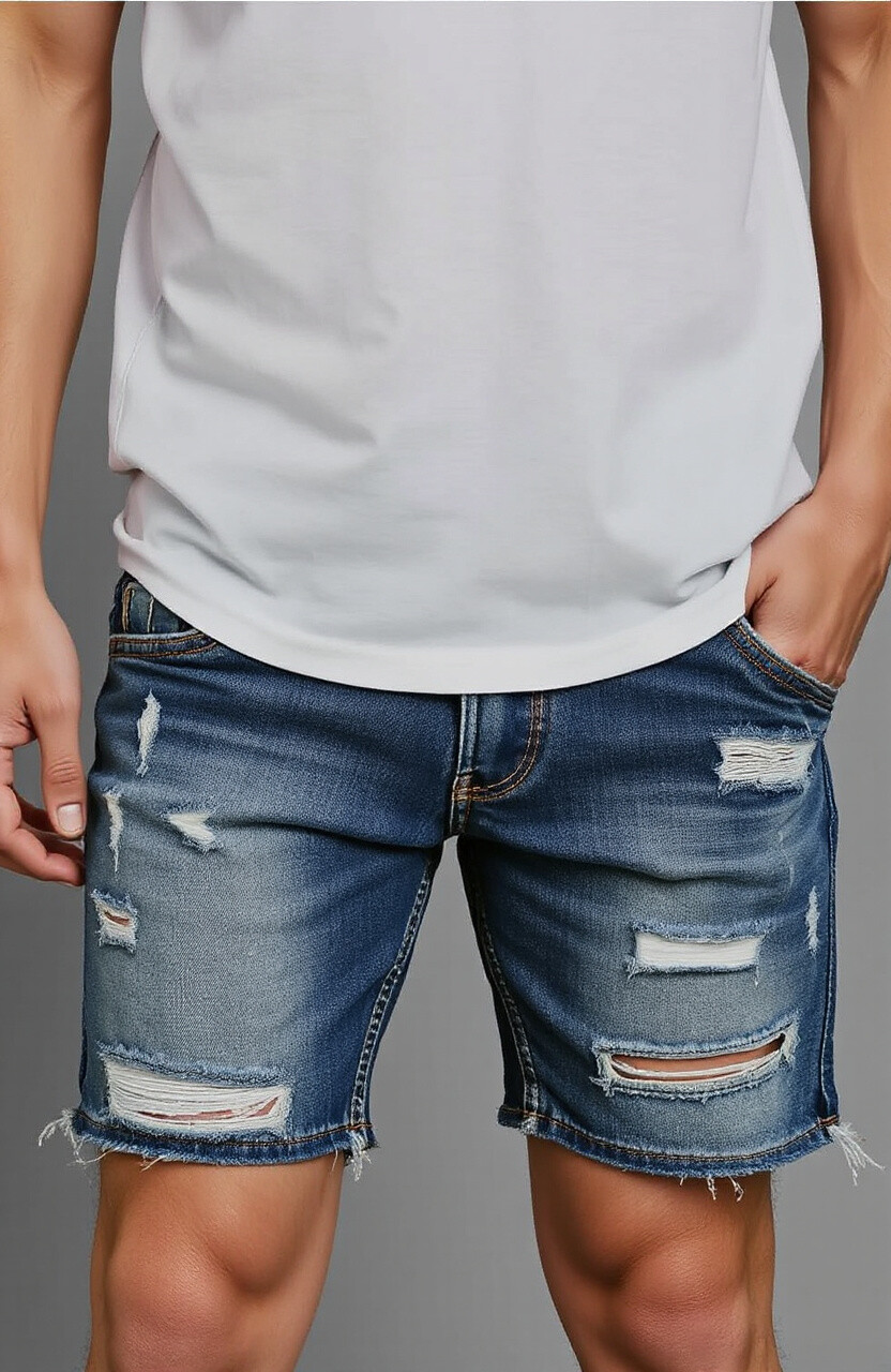 Distressed denim shorts add a rugged, edgy feel to your look. They’re perfect for casual outings.