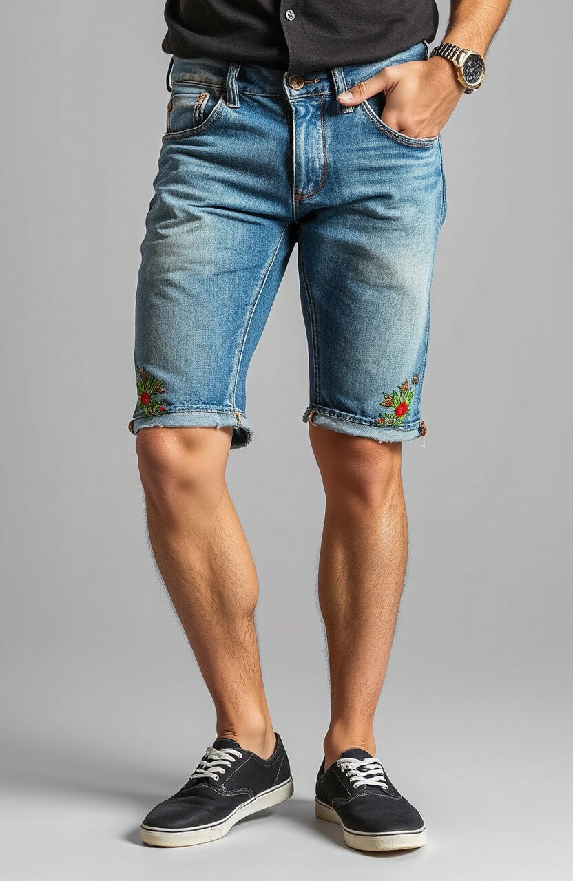 Embroidered denim shorts add a touch of artistry and personality. They’re unique and perfect for creative individuals.