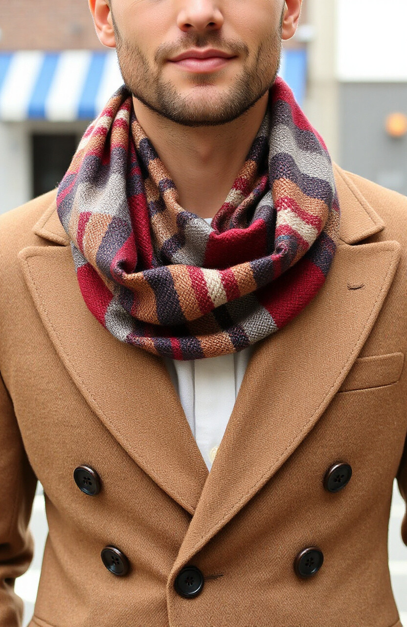 Wrap a patterned scarf around your neck with a double-breasted jacket for added style and warmth.