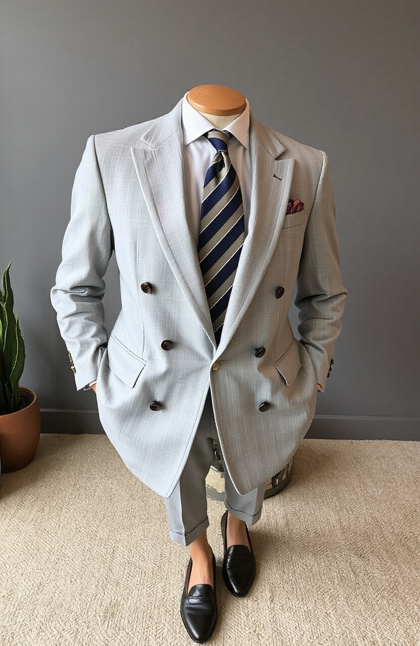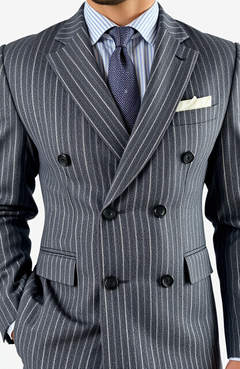 A striped double-breasted suit can elongate your frame and add a touch of flair. Pinstripes are a classic choice.
