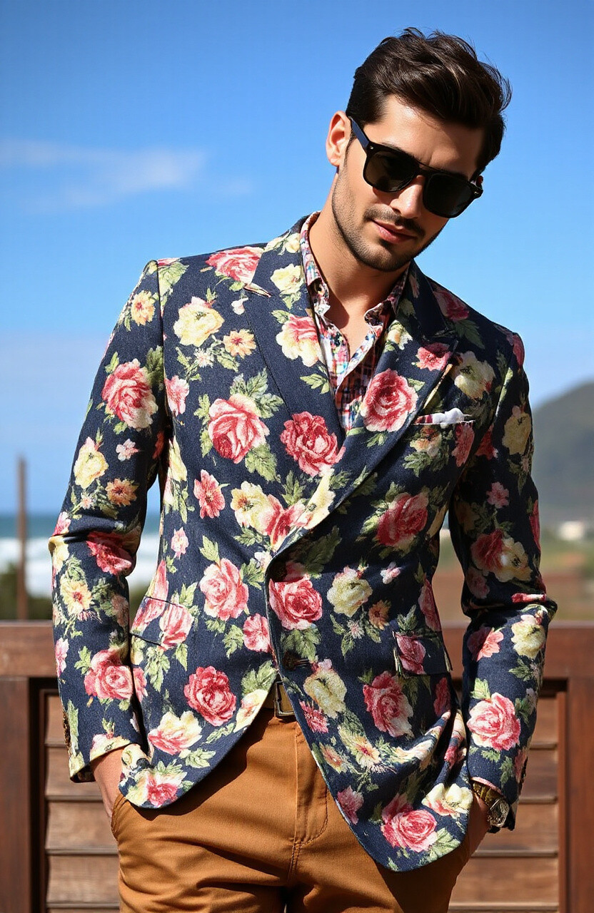 Floral patterns on a double-breasted jacket can add a whimsical touch. Keep the rest of the outfit simple.