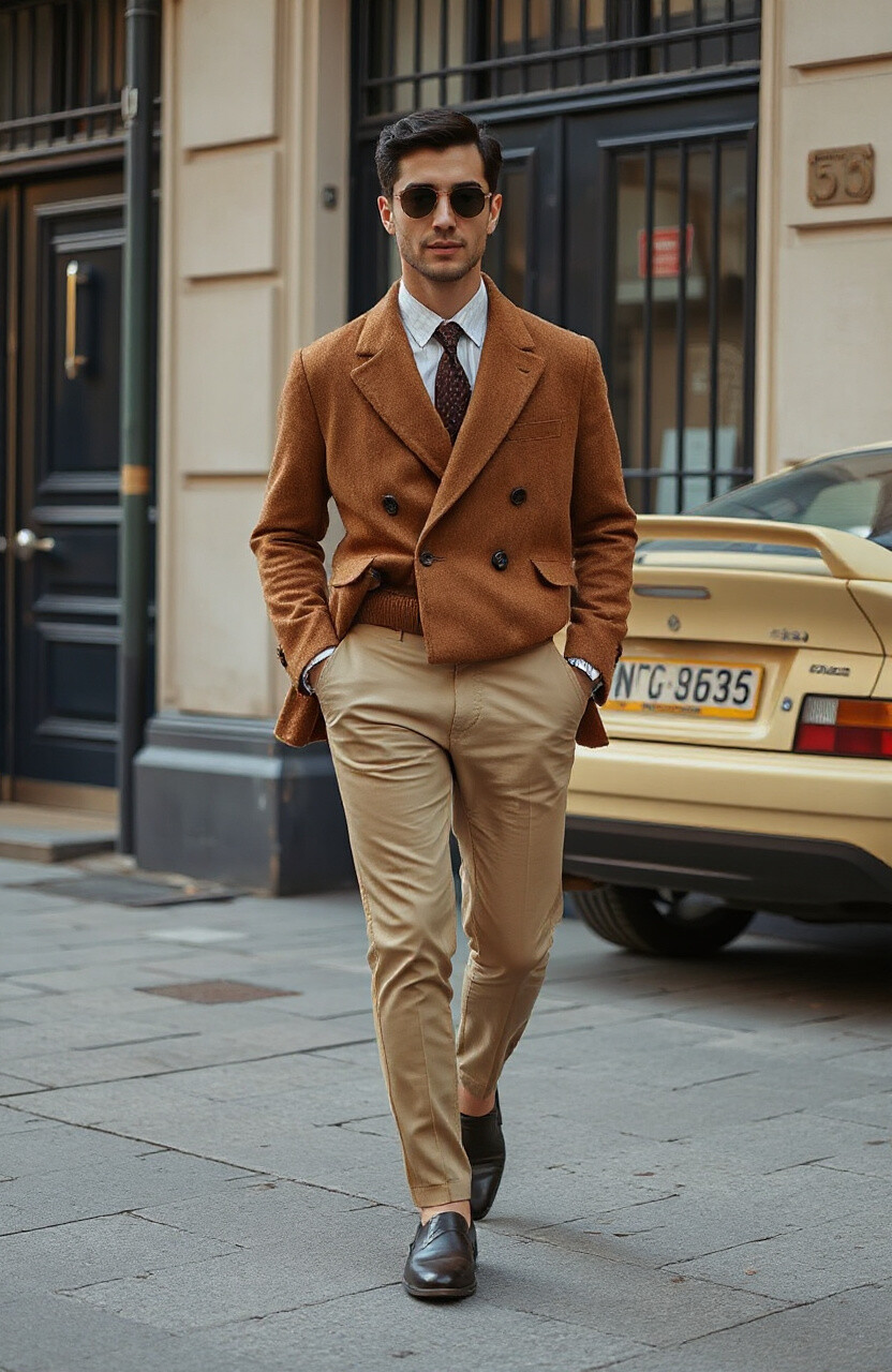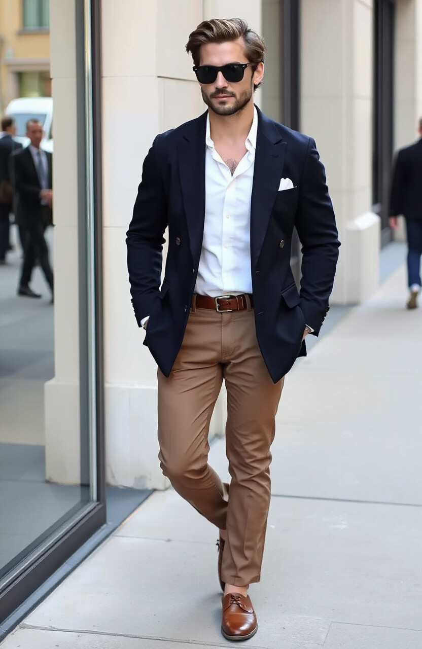 Start with a classic navy double-breasted blazer. It’s versatile and can be worn with almost anything. Pair it with khaki pants for a smart casual look.