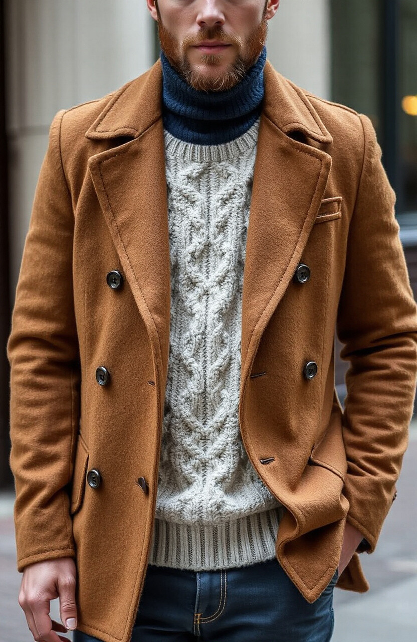 Choose a double-breasted wool coat for those chilly days. It’s both stylish and functional, keeping you warm and fashionable.