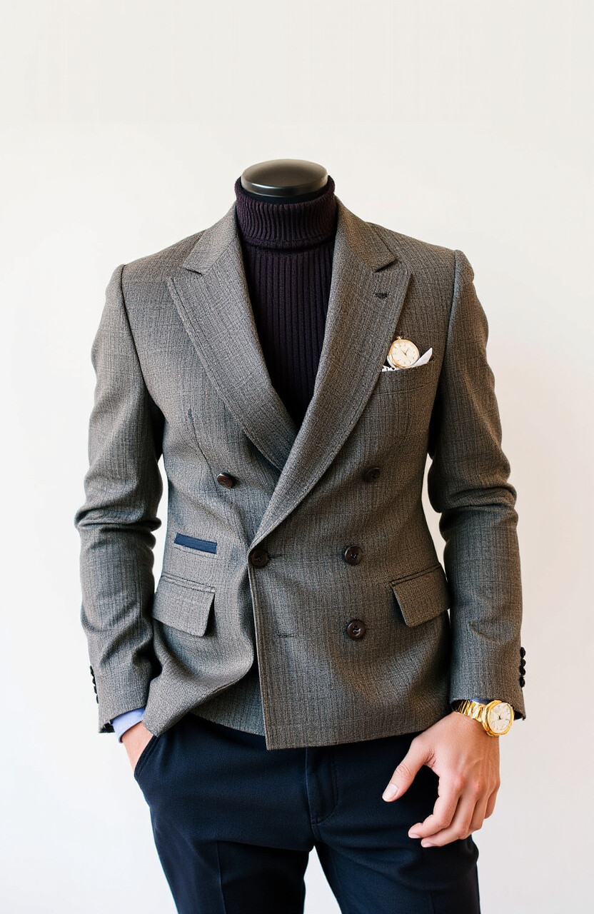 Combine a double-breasted jacket with a roll neck for a sophisticated look. It’s perfect for transitional weather.