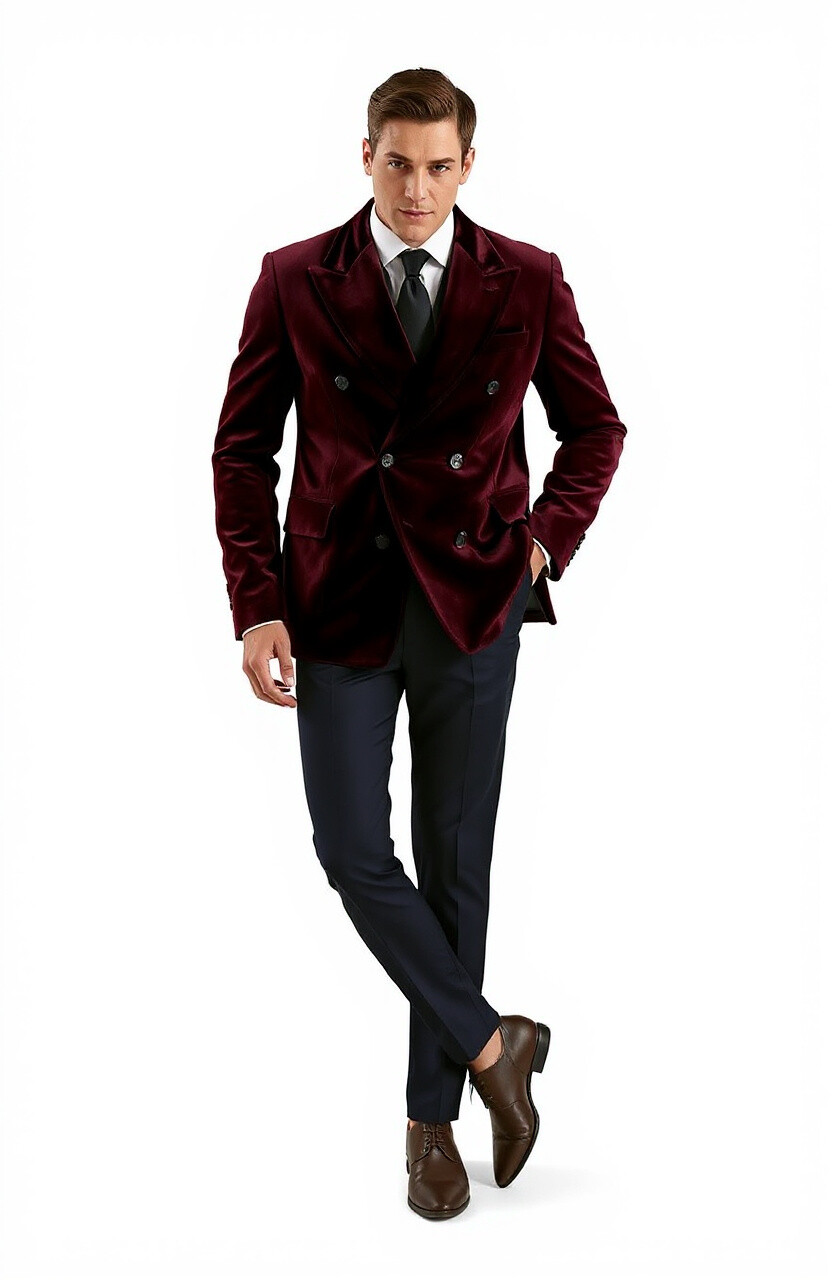 Velvet double-breasted jackets add a luxurious touch. Perfect for evening events or special occasions.