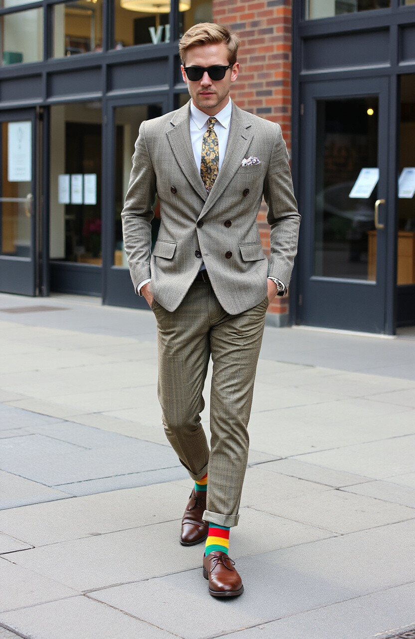 Show off bold, colorful socks with your double-breasted ensemble. It’s a fun way to add personality.