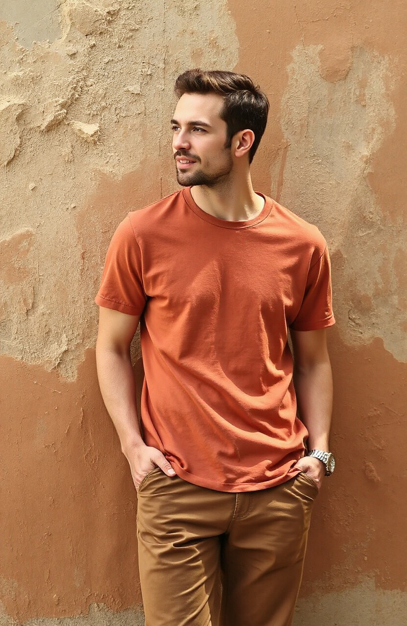 Consider clay in casual wear like t-shirts or chinos. It’s a color that feels relaxed yet stylish.