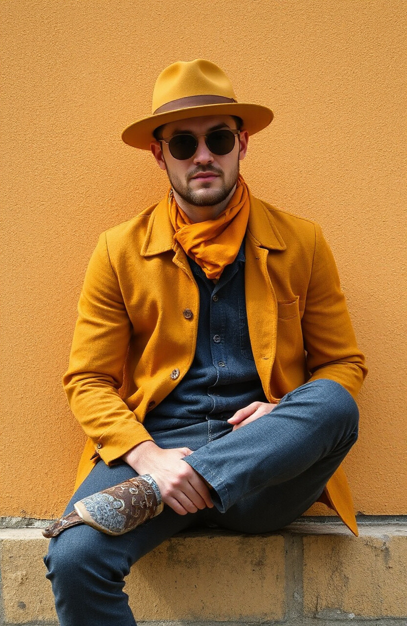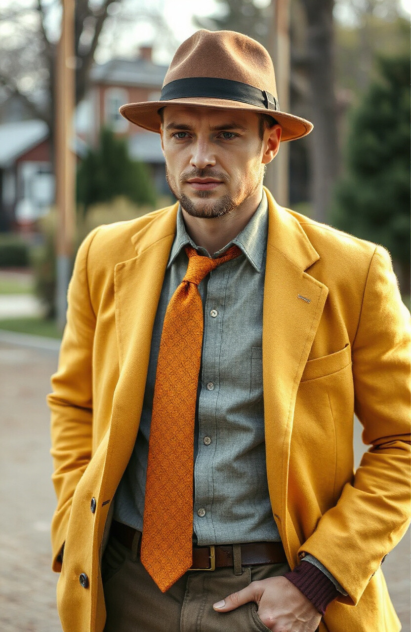 Try mustard in accessories like hats or ties to brighten up any outfit. It’s a bold choice that shows confidence and creativity.