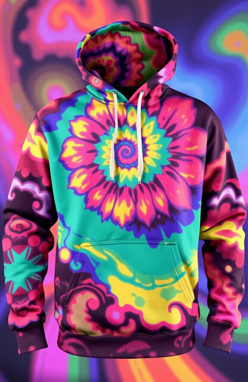 Get lost in a swirl of colors with a psychedelic-inspired hoodie. It’s a vibrant and eye-catching addition to your wardrobe. Ideal for those who love bold fashion.