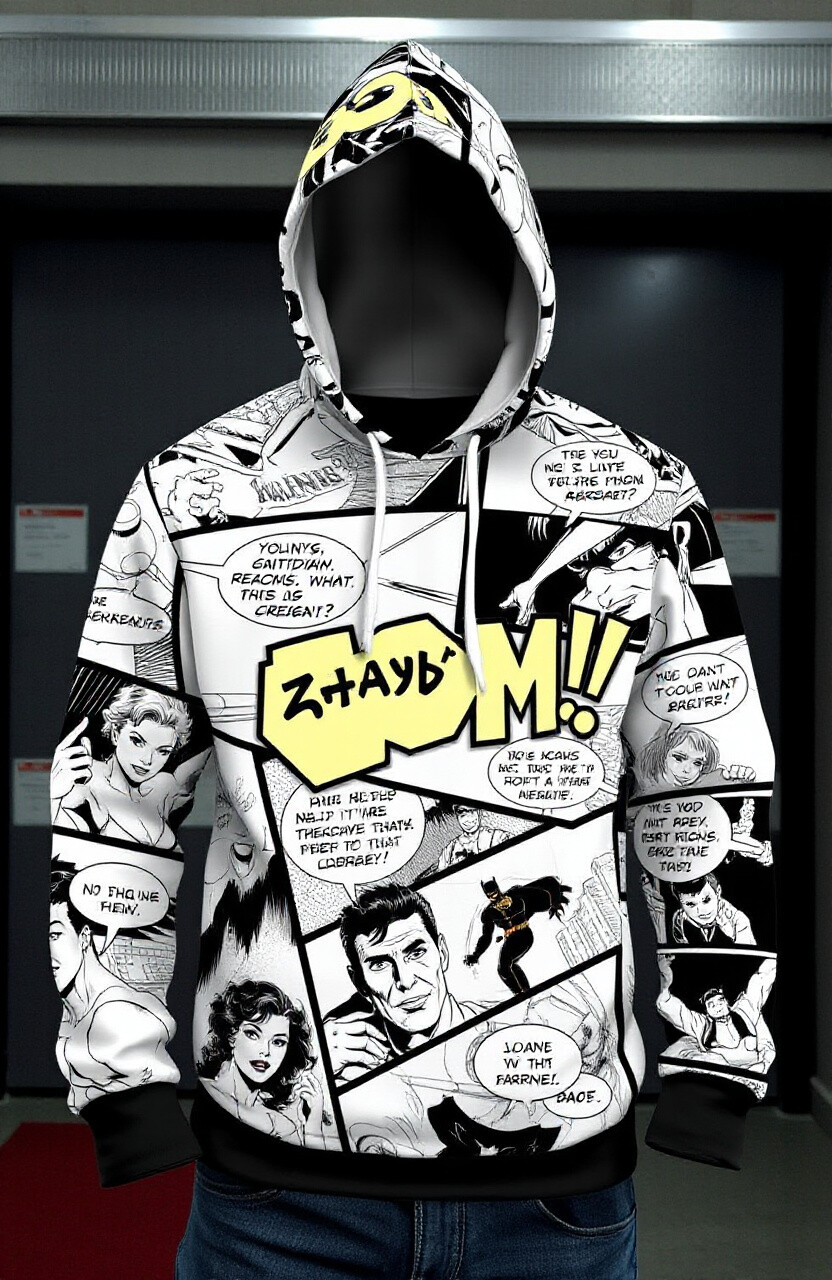 Step into the world of comics with a hoodie that features comic strip designs. It’s a fun and creative addition to your wardrobe. Great for comic book enthusiasts.