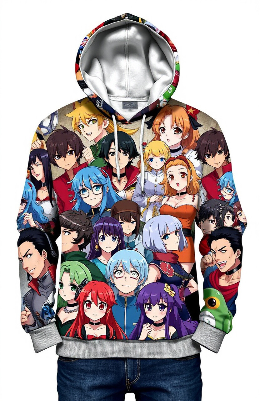 Anime lovers will adore this hoodie adorned with vibrant character prints. It’s a colorful way to showcase your favorite series. Great for conventions or casual hangouts.