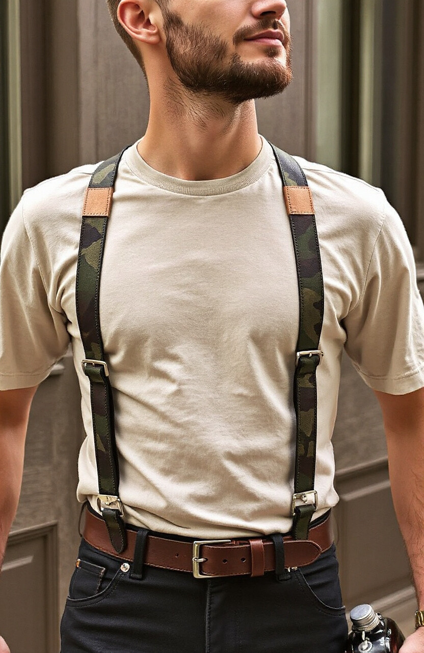 For the adventurous and bold, camouflage leather suspenders are a daring choice. They add a playful yet stylish element to your outfit, perfect for outdoor events or casual outings. Pair them with a simple tee to let the suspenders shine.