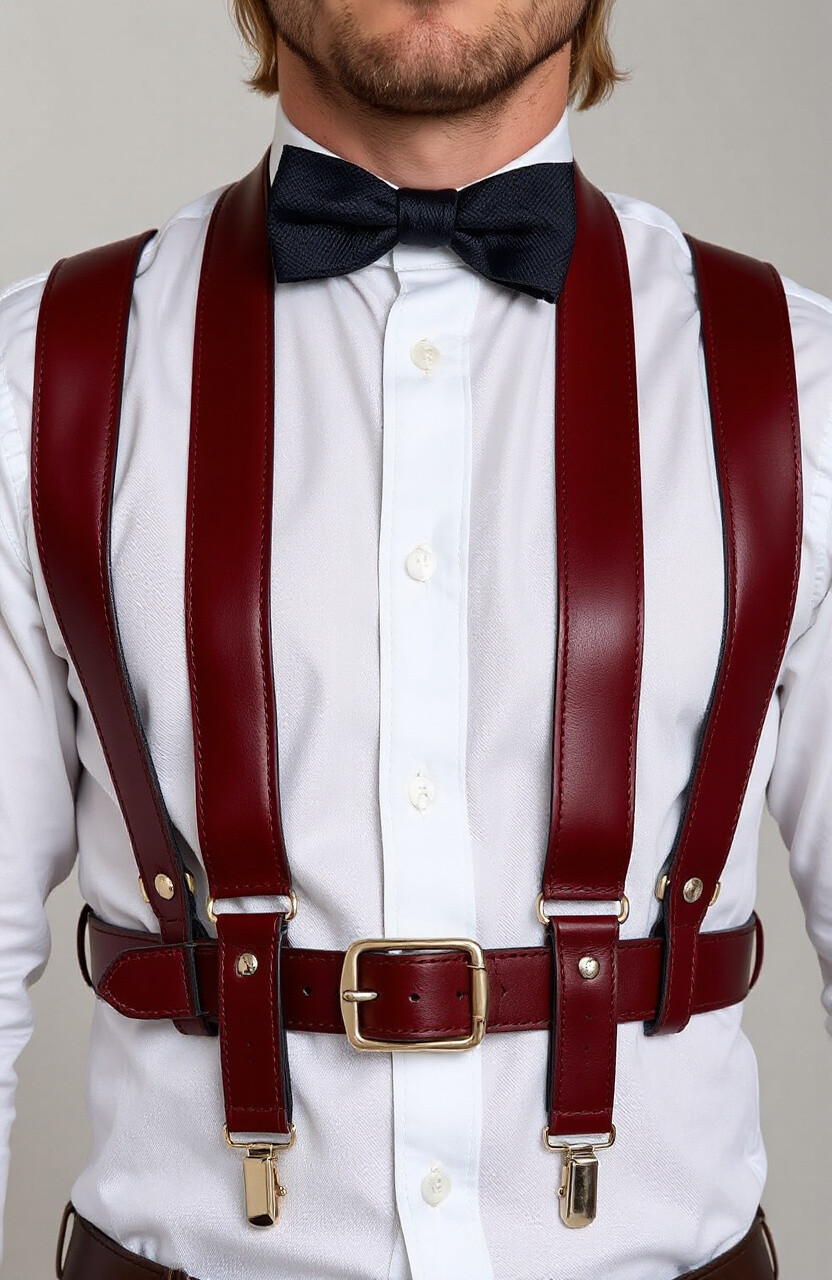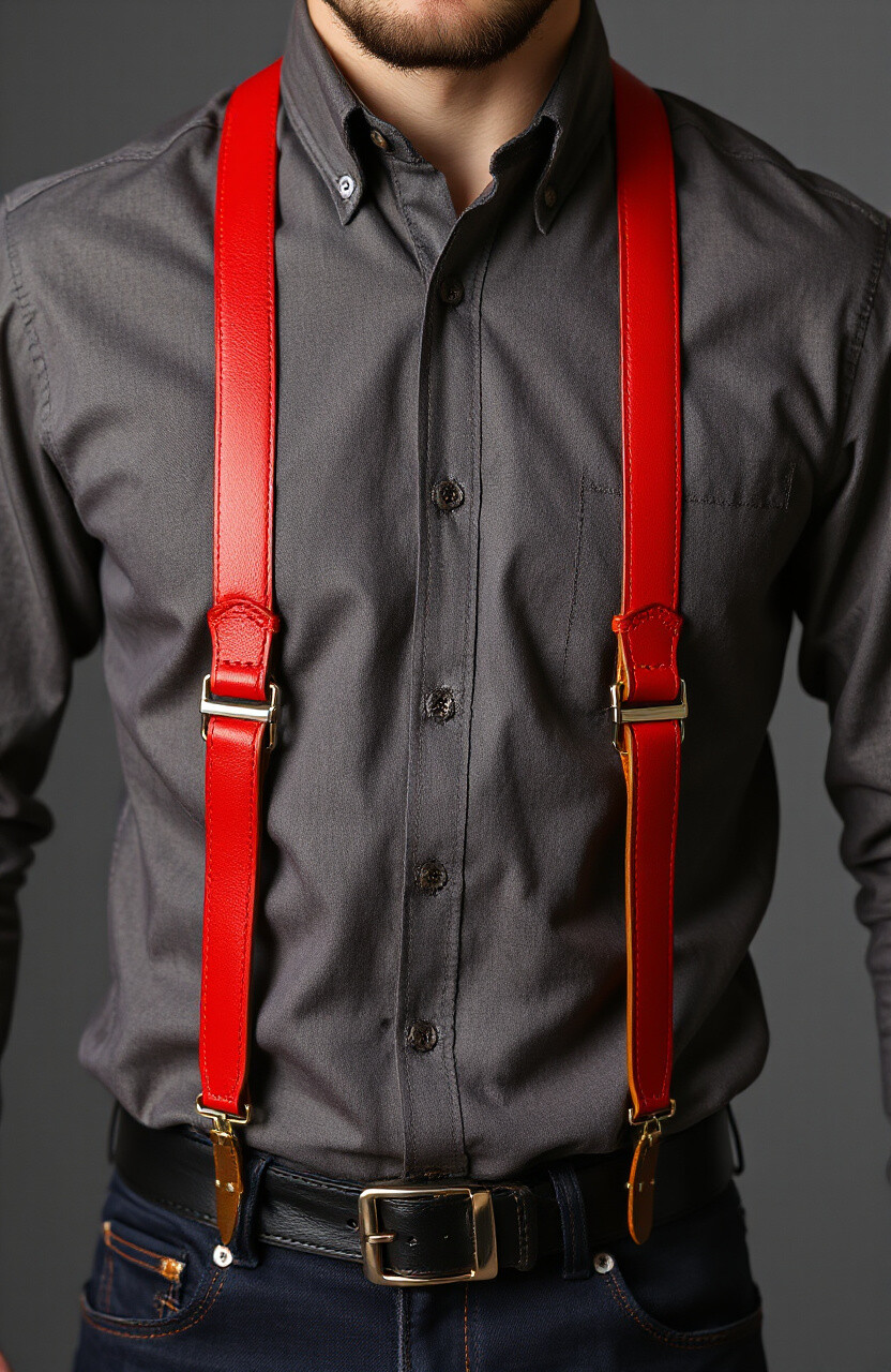 Red leather suspenders are for those who aren’t afraid to make a statement. Vibrant and bold, they add a splash of color to any outfit, making them perfect for festive occasions or nights out. Wear them with a black or white shirt for maximum impact.
